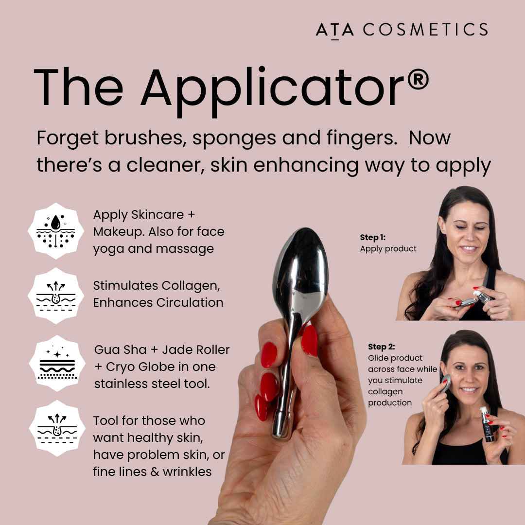 This patented stainless-steel tool replaces brushes, sponges, and fingers, giving you a hygienic option to apply product while helping stimulate collagen, boosting circulation, and sculpting. Cooling, precise, and effortless, The Applicator® elevates your routine and delivers professional-quality results—right from your vanity.