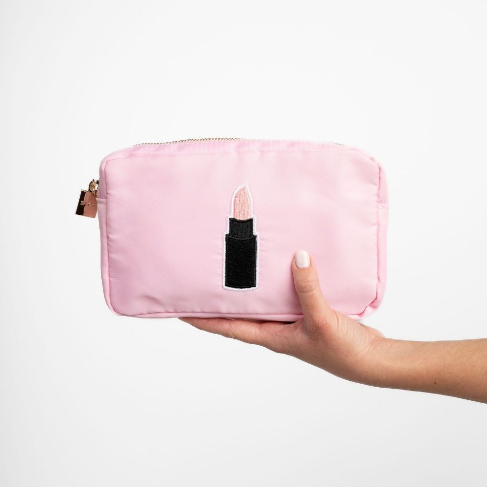 A chenille lipstick appliqué and gleaming hardware refine this nylon-canvas cosmetic bag with a trio of interior pockets to keep essentials organized. This bag helps keep cosmetics and skincare essentials lovingly secured when at home and on the go.