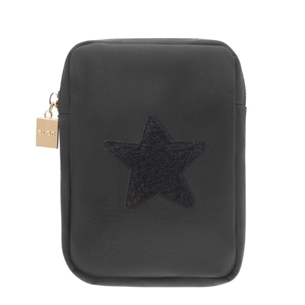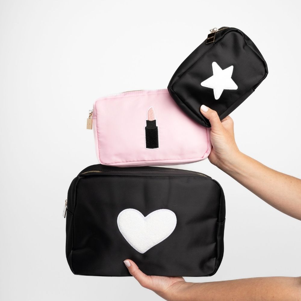 A mini nylon cosmetics bag featuring a darling chenille star patch on the front. This bag is ideal for storing lipstick and other smaller cosmetics when at home and on the go. It’s designed with a convenient top zip closure and interior pockets for easy organizing.