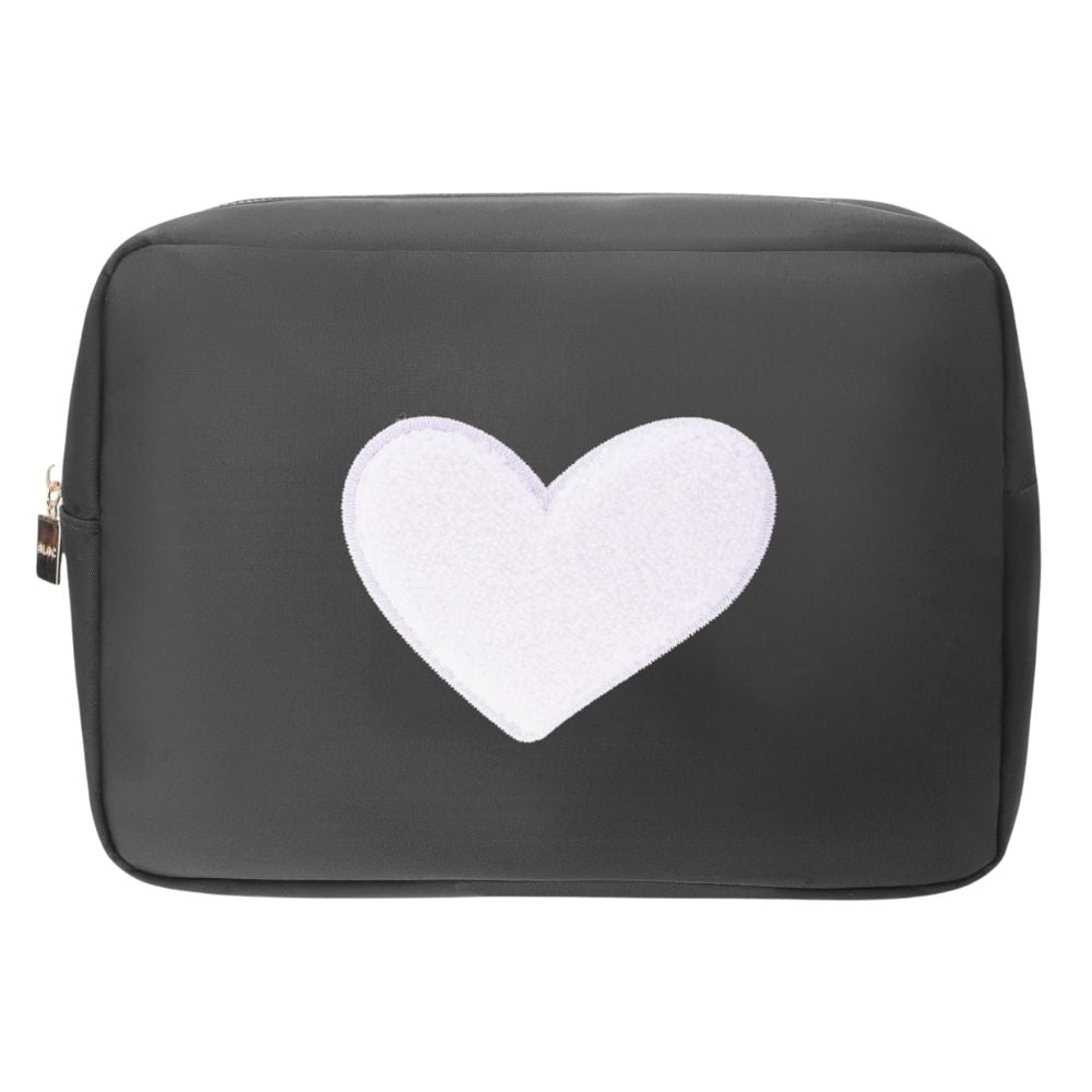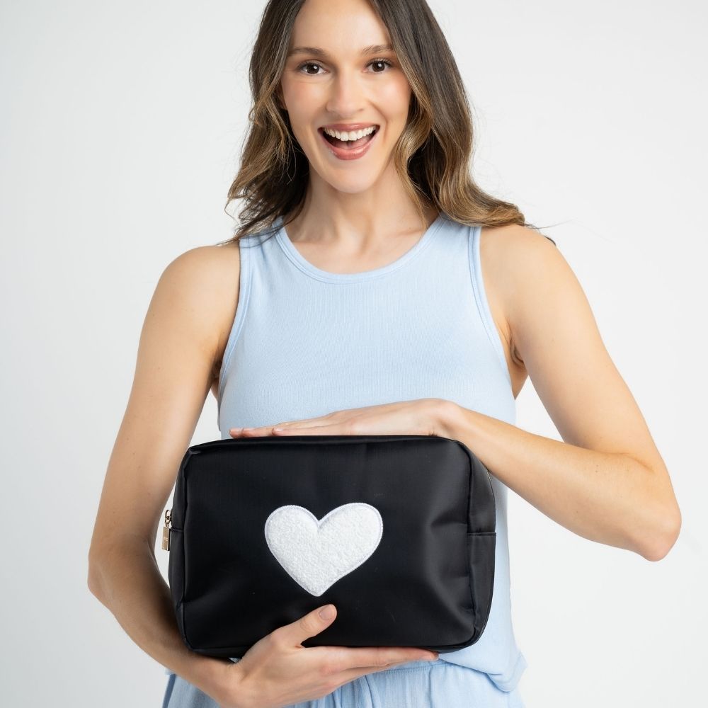 An extra-large nylon bag featuring a darling chenille heart patch on the front. This bag helps keep cosmetics and skincare essentials lovingly secured when at home and on the go. It’s designed with a convenient top zip closure and interior pockets for easy organizing.