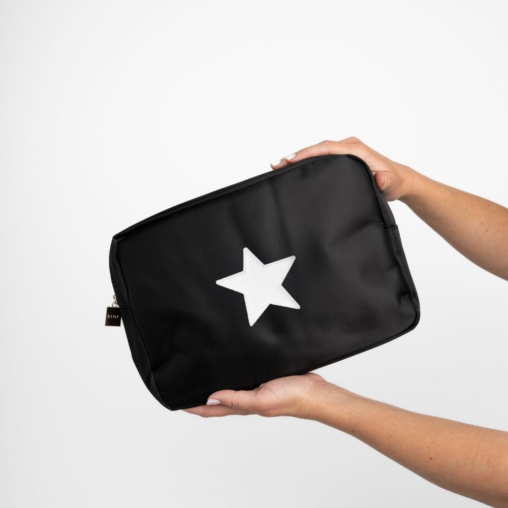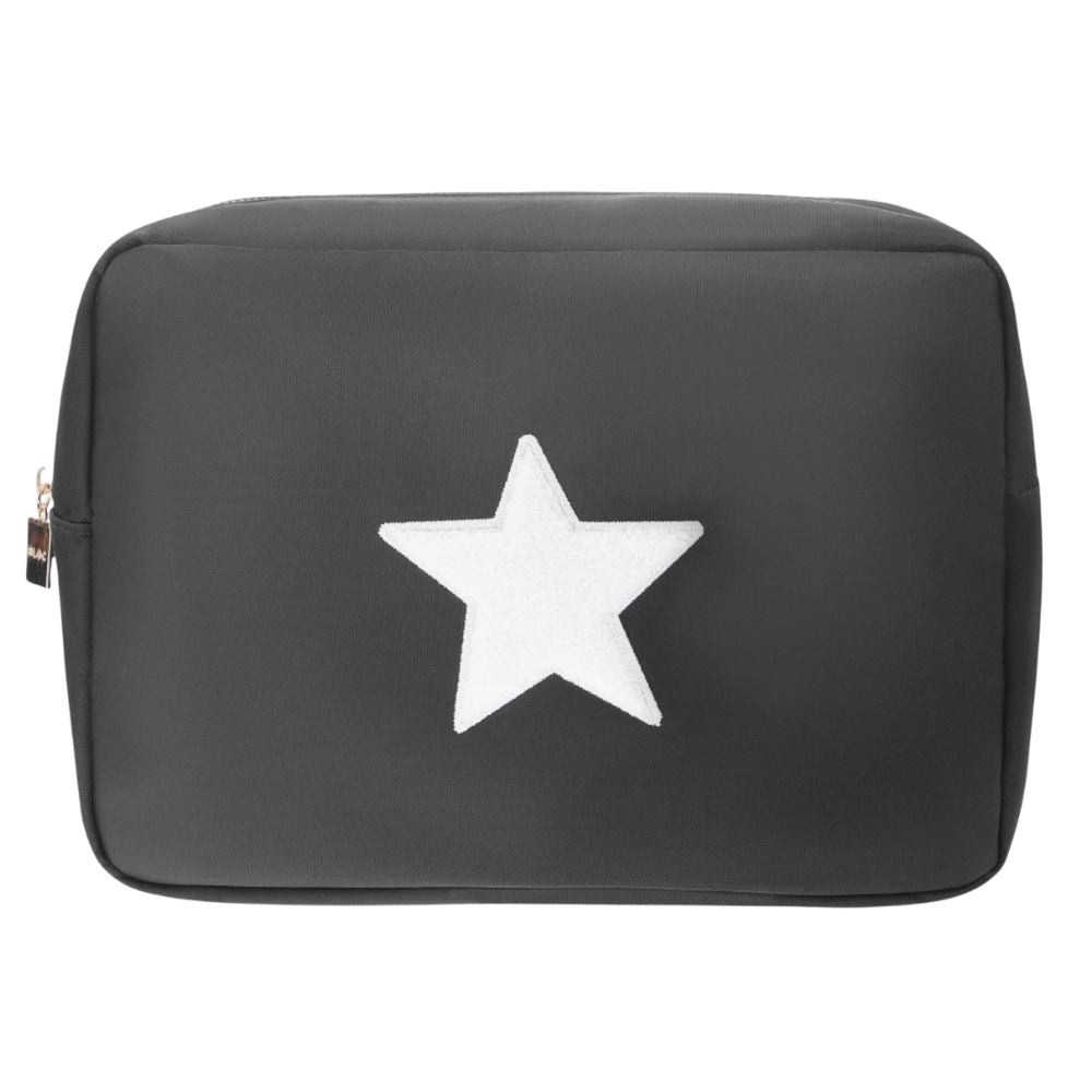 An extra-large nylon bag featuring a darling star appliqué and gleaming hardware. This bag helps keep cosmetics and skincare essentials lovingly secured when at home and on the go. It's designed with a convenient top zip closure and interior pockets for easy organizing.
