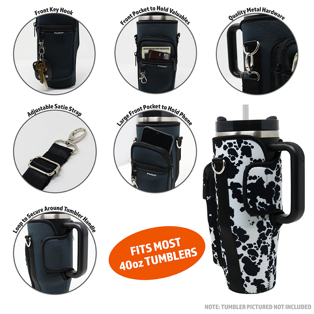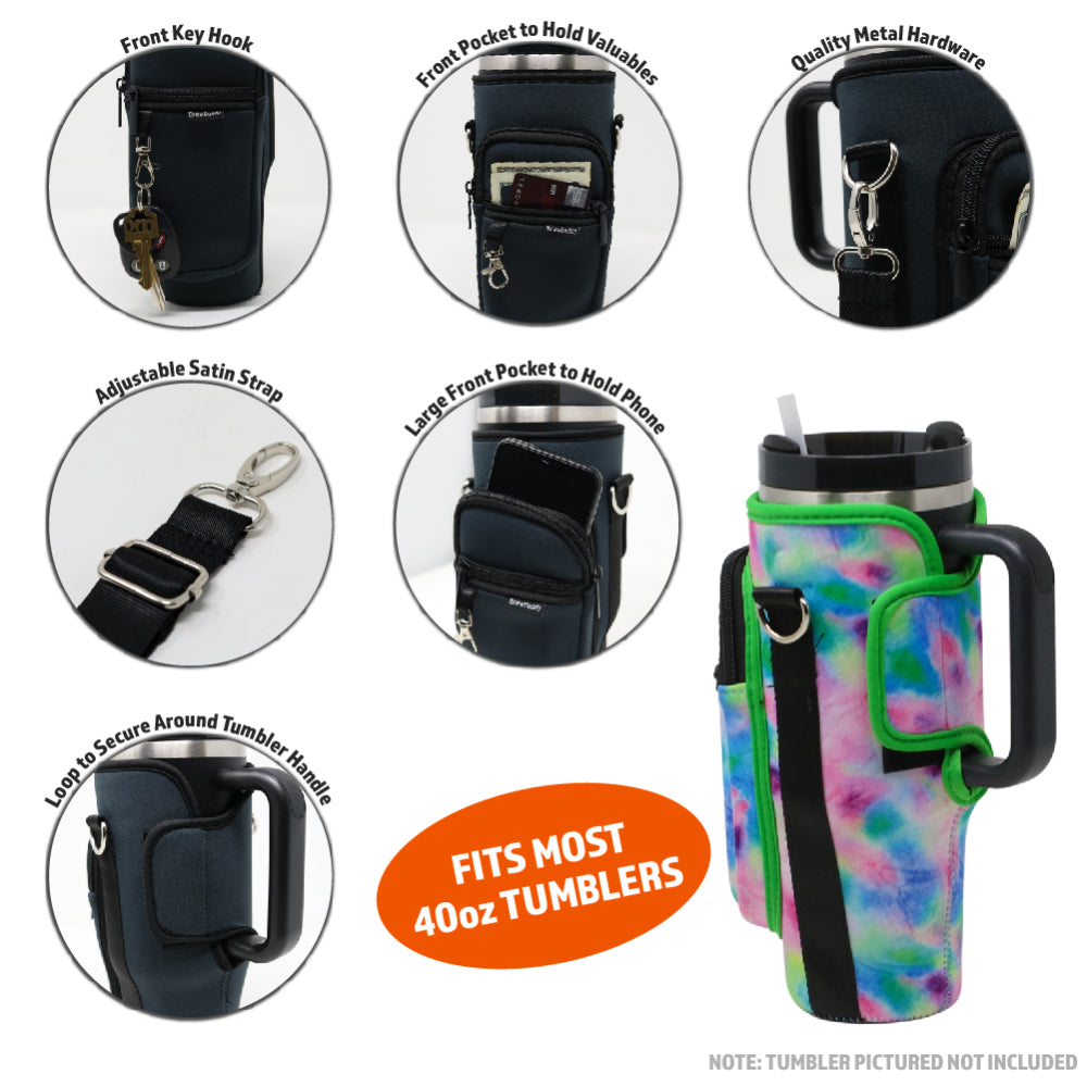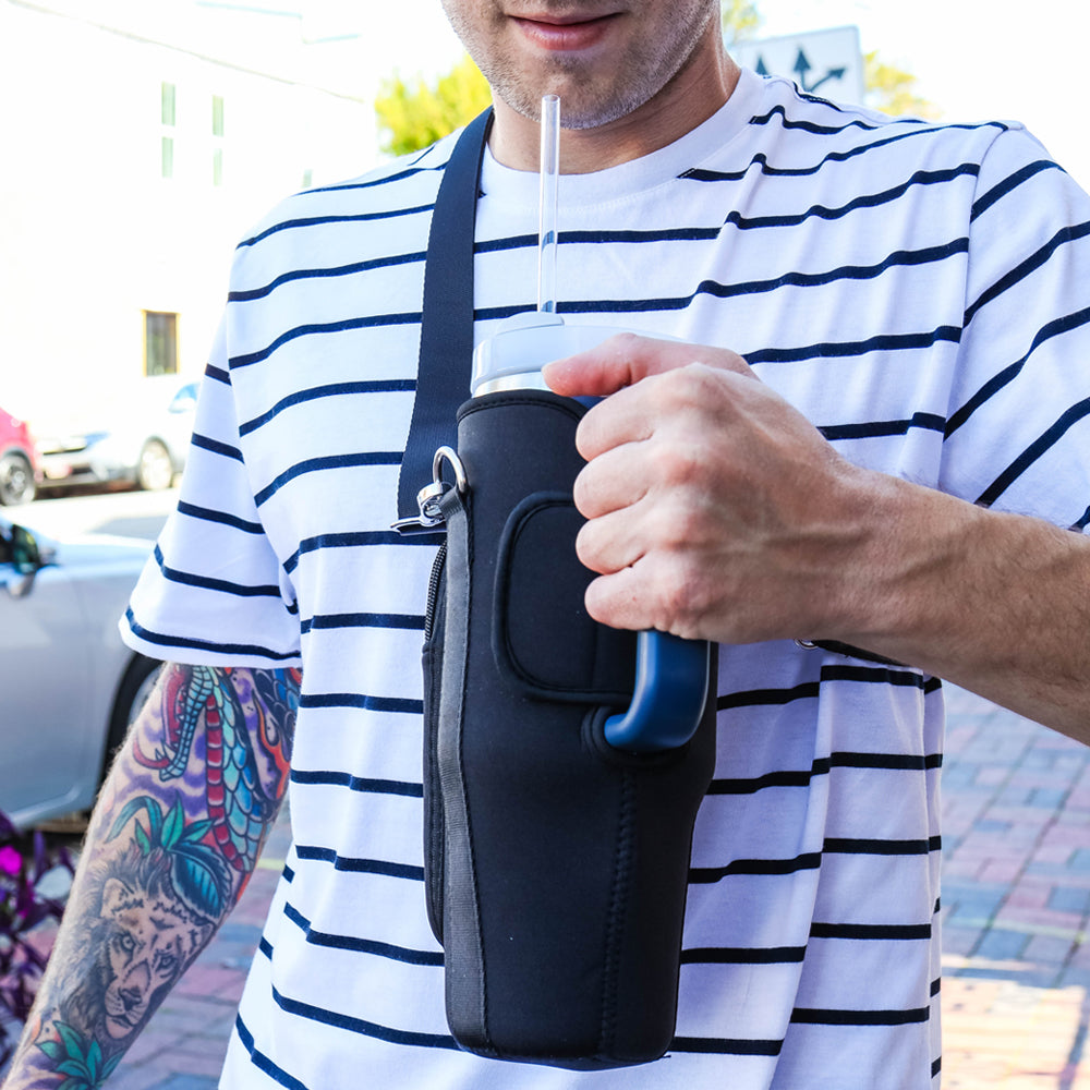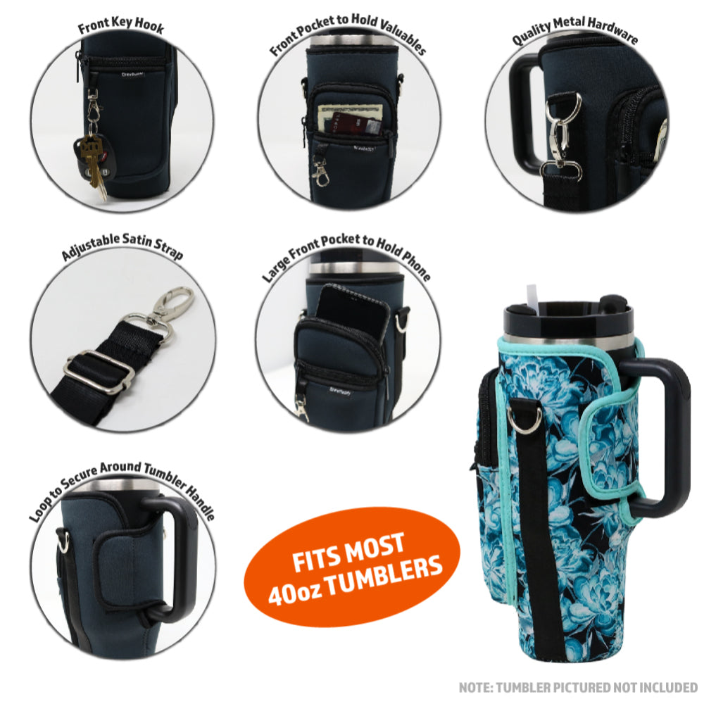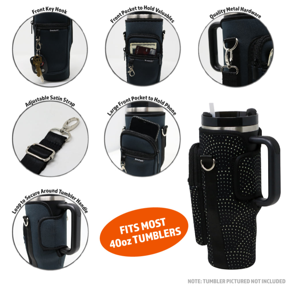 Easily carry your favorite 40 oz tumbler with this unique crossbody sling bag, designed to keep your hands free and your valuables safe. It’s equipped with two front zipper pockets and an adjustable satin strap for a convenient, customized fit.