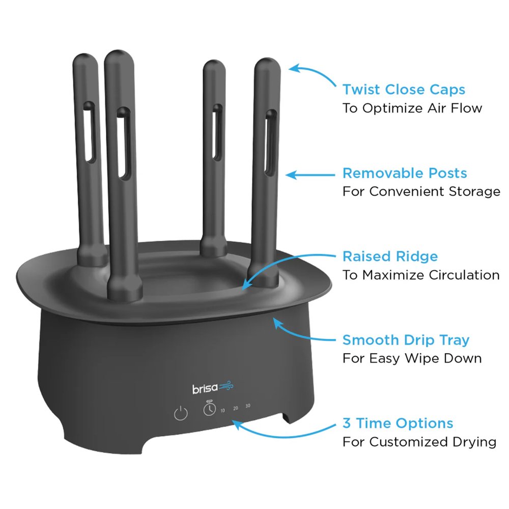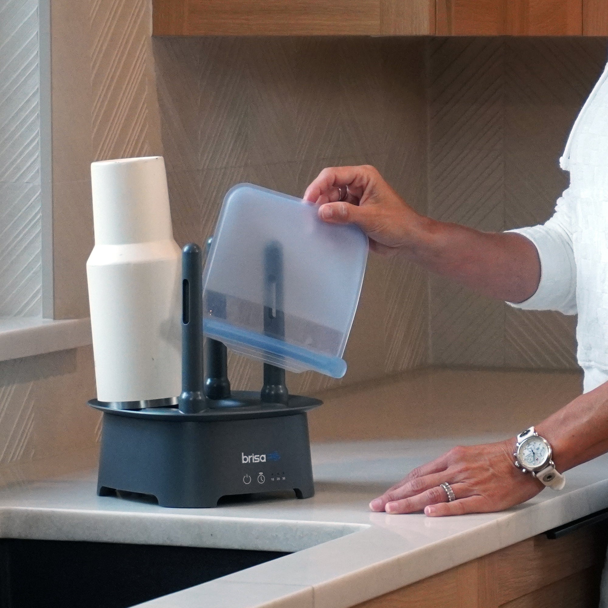 The Brisa Rack is the smarter way to dry reusable kitchen items. This compact electric drying rack quickly dries reusable kitchen items like bottles, bags, containers, baby bottles, wine decanters, and more. It fits neatly on your counter and uses warm air with timed cycles to eliminate residual moisture that can lead to mold.