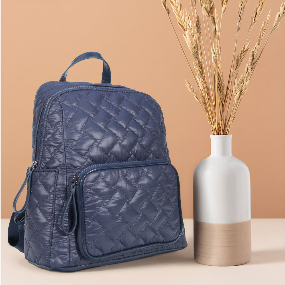 Meet the Talia Backpack, the ideal blend of style and practicality. Made with quilted nylon, this durable backpack is great for daily use or adventures. The vegan leather-accented top handle adds sophistication, while the adjustable straps ensure a comfortable fit. For convenience, it features a spacious exterior zipper pocket for easy access and interior pockets for organized storage.