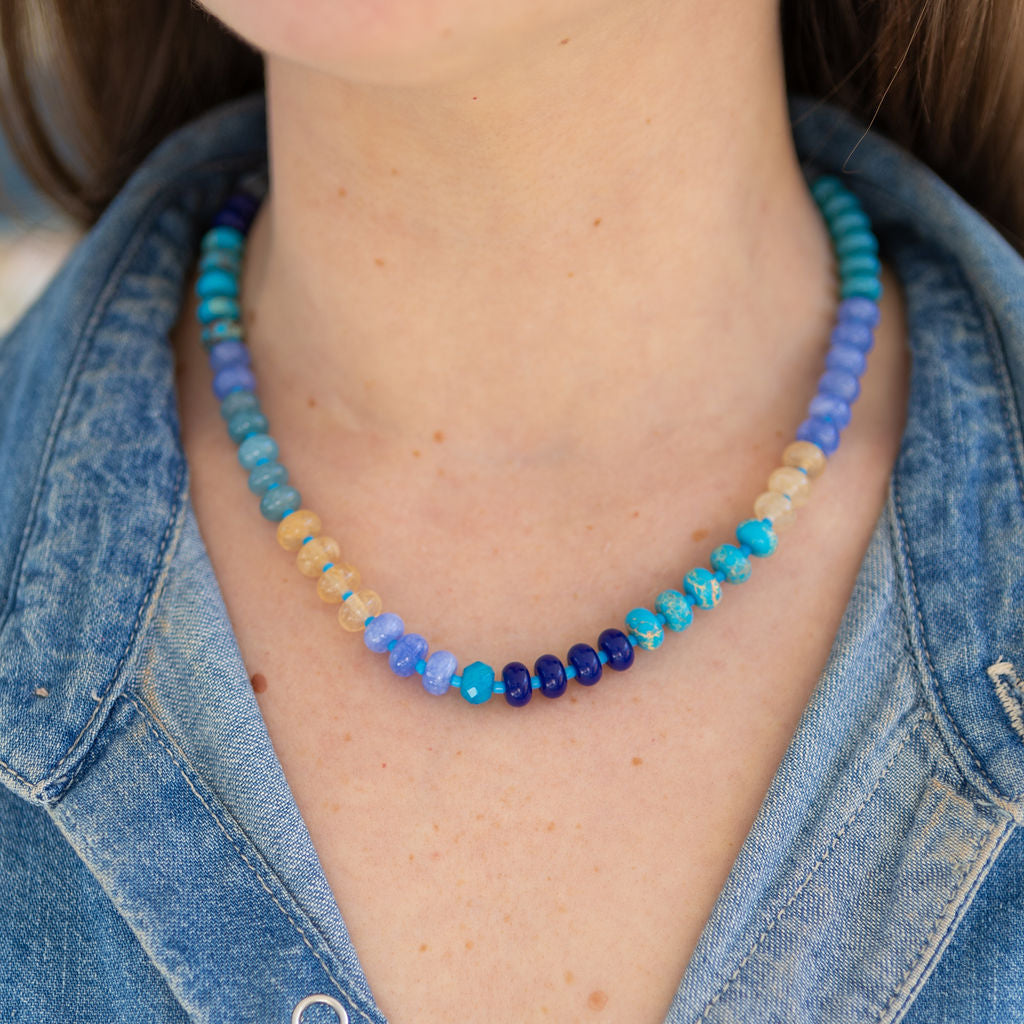 Named “Beautiful Moon,” this necklace captures the stunning colors of the moon’s many phases. Shades of blue mingle with warm tones of caramel toffee, cream, and peach, reminiscent of a blue moon, pink moon, orange moon, and yellow moon. Ethereal and luminous, this necklace feels like a little piece of the night sky brought to life.