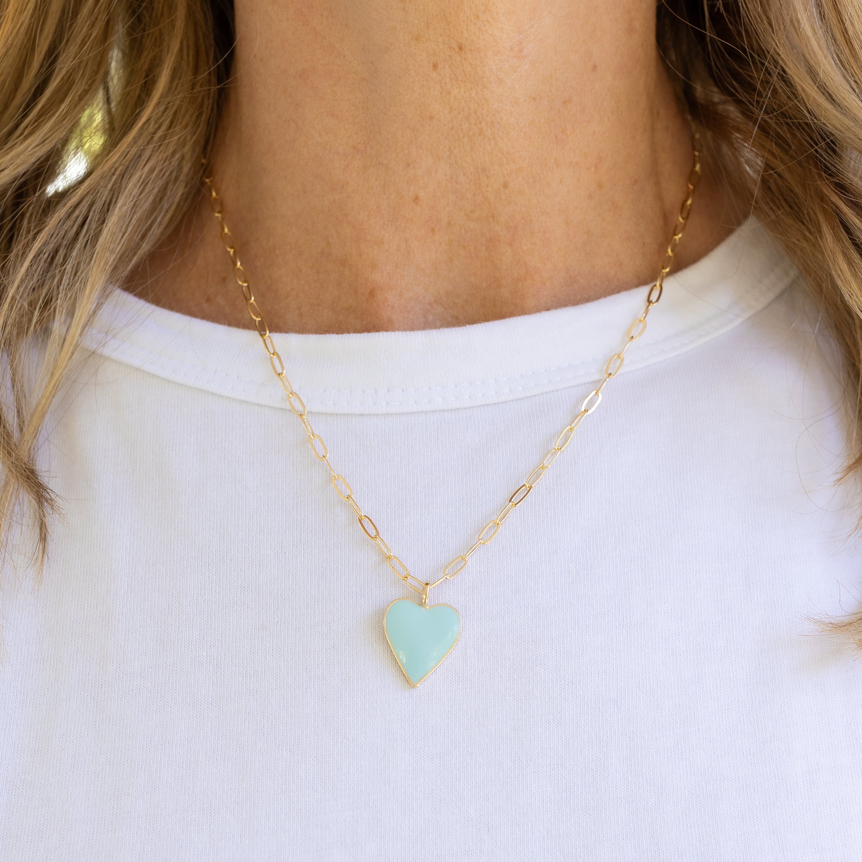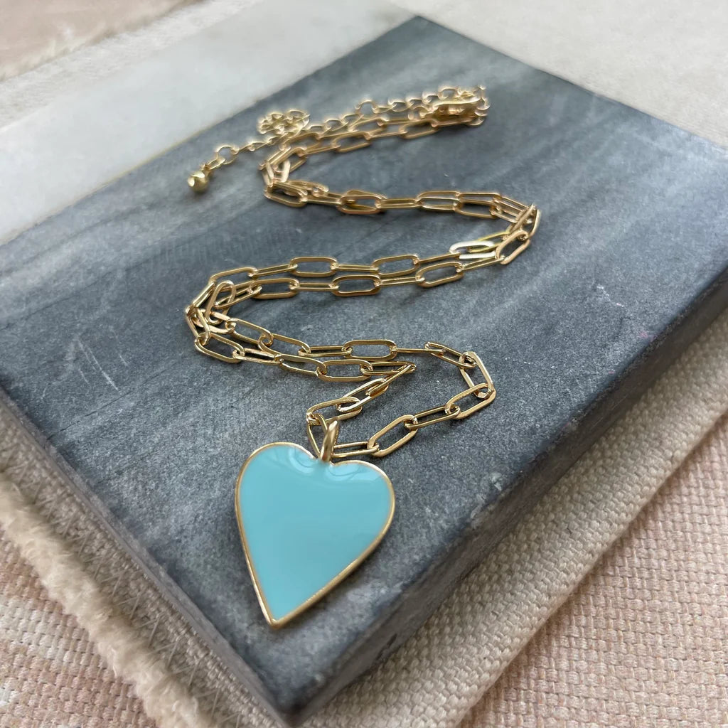 This blue heart necklace shines from a gold rectangle chain! Wear it solo for a chic accessory or as a layering piece.