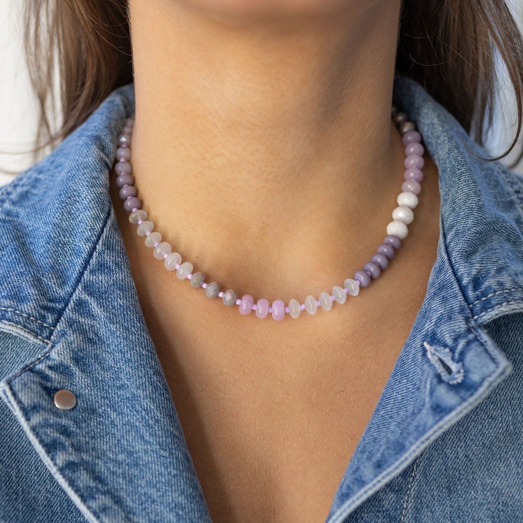 These colors are reminiscent of paintings by the artist Claude Monet with beautiful shades of lilac and orchid. The resin stones are lightweight, making this necklace a beautiful piece to layer with other jewelry from your collection.