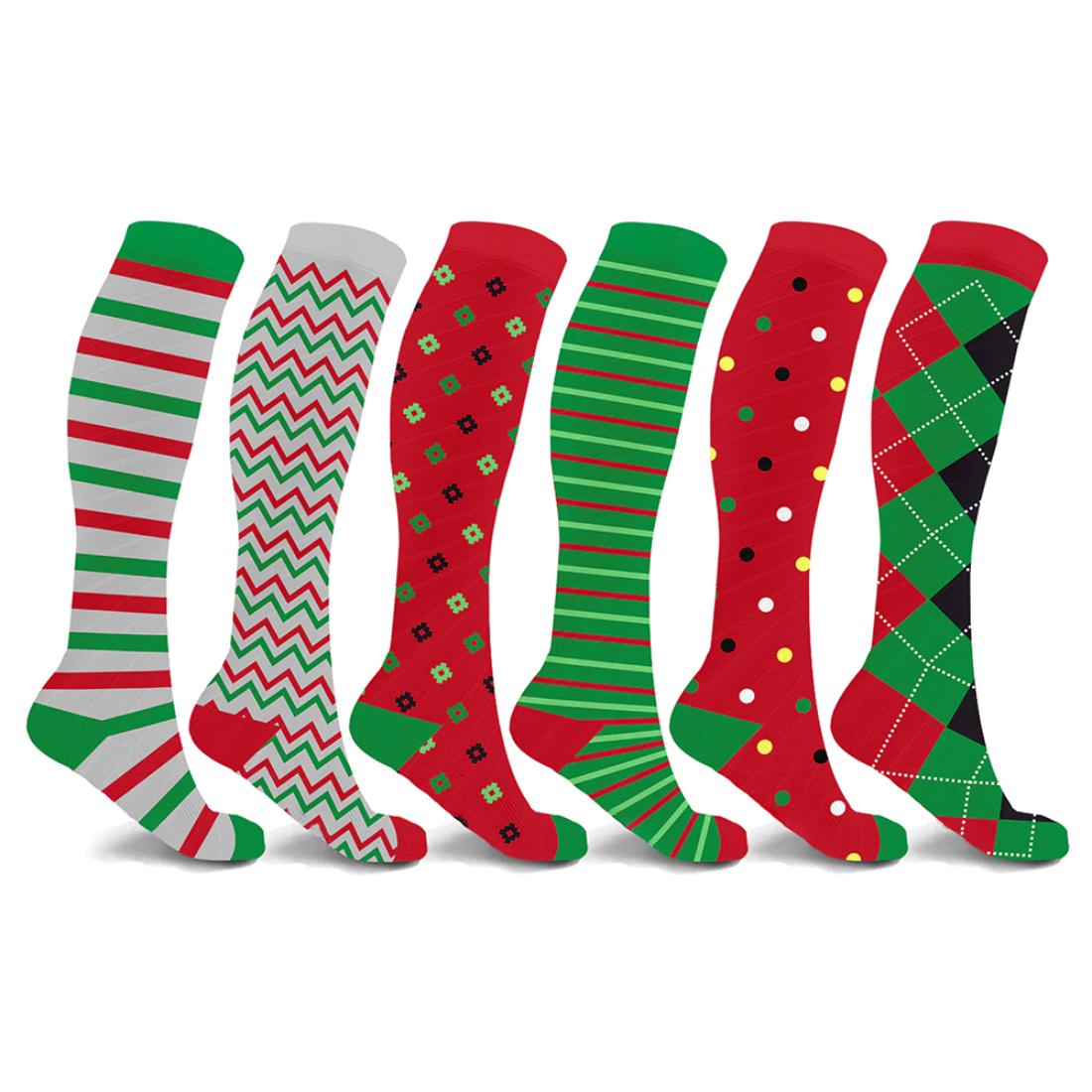 Includes six (6) pairs of Christmas Themed Knee-High Compression Socks in size of your choice