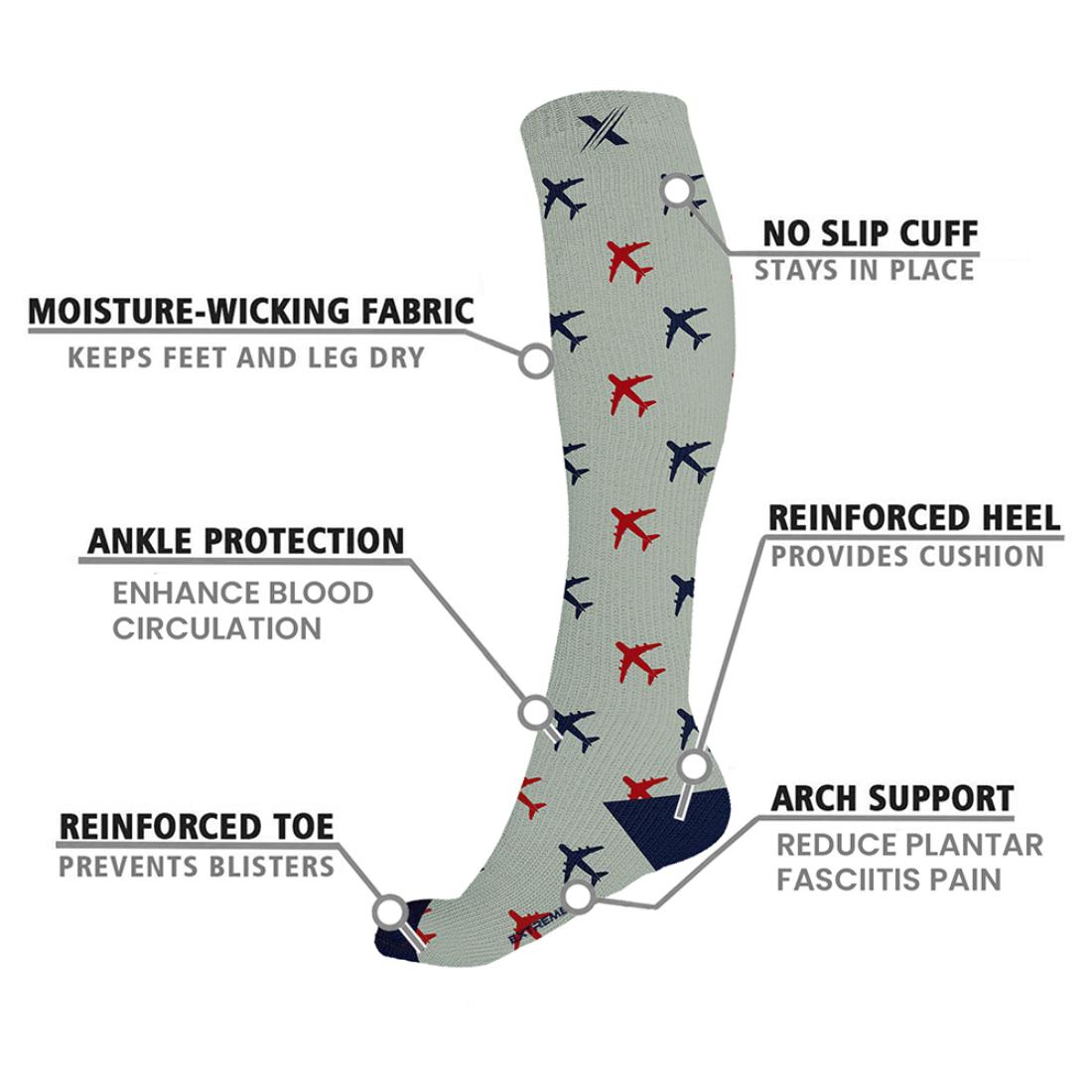 Step into patriotic pride and comfort with these quality knee-high compression socks. Designed to improve circulation, reduce swelling, and relieve aches and fatigue, these socks are ideal for running, cycling, travel, pregnancy, and more. They also offer antimicrobial properties, working to eliminate 99.9% of bacteria and fungi to ensure a comfortable, rejuvenating experience for your feet.