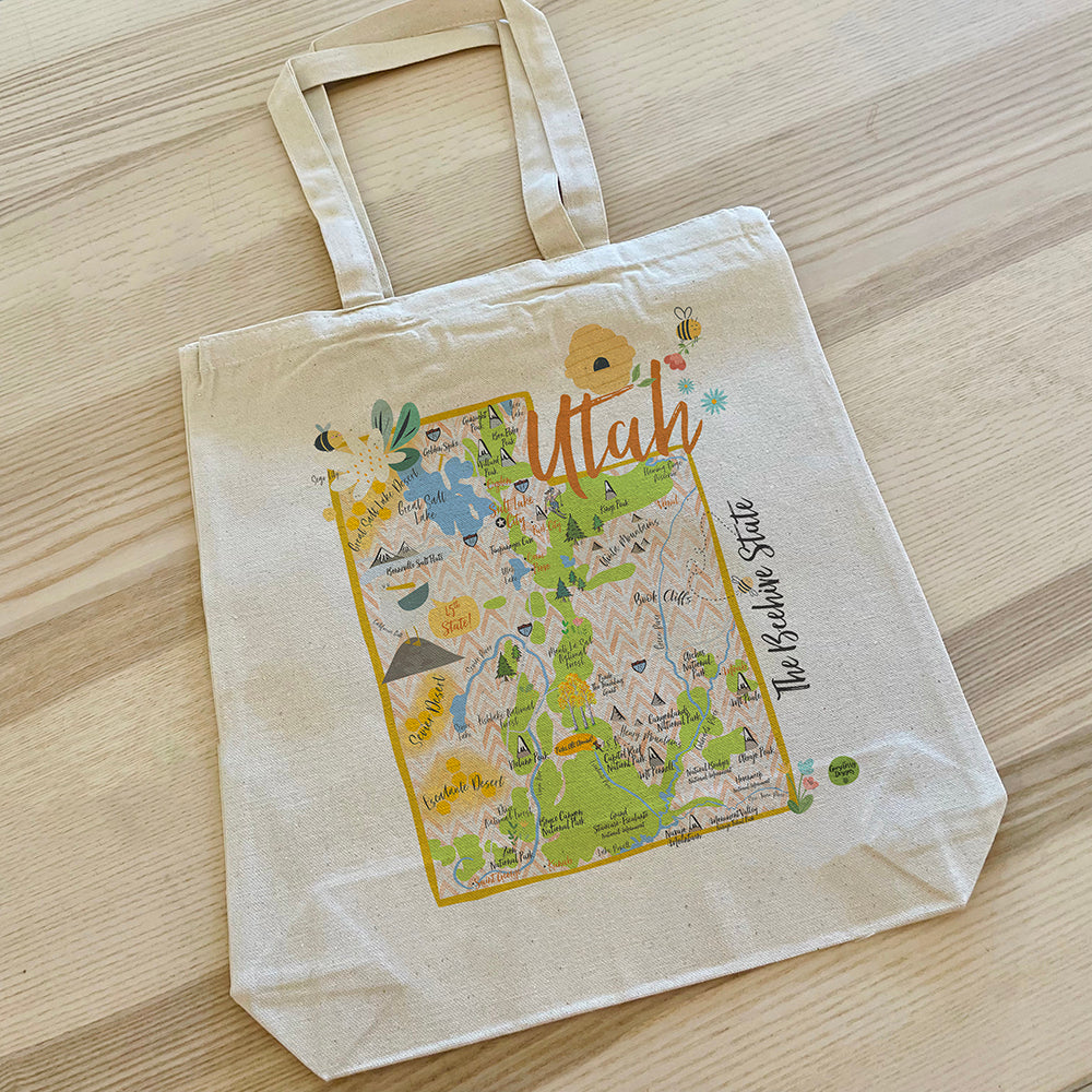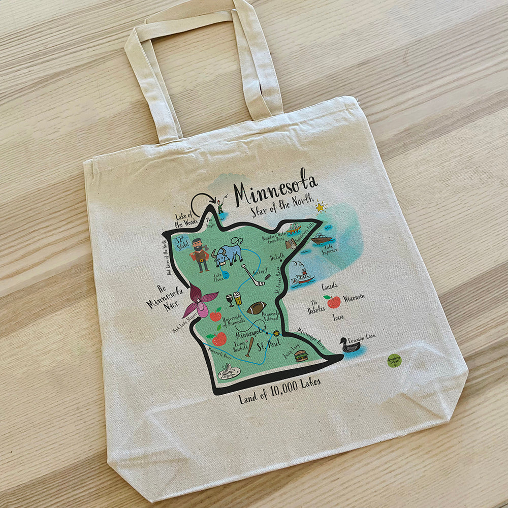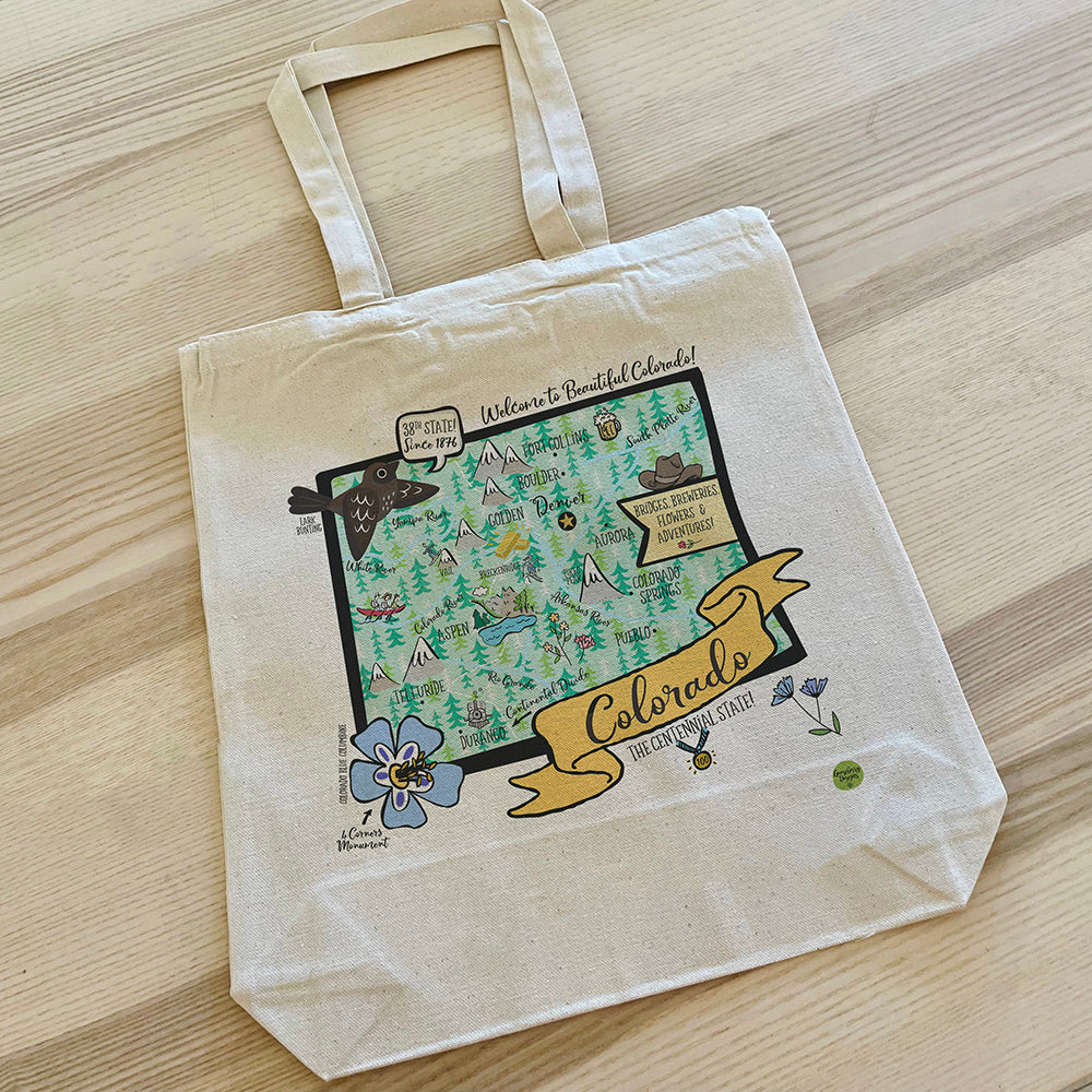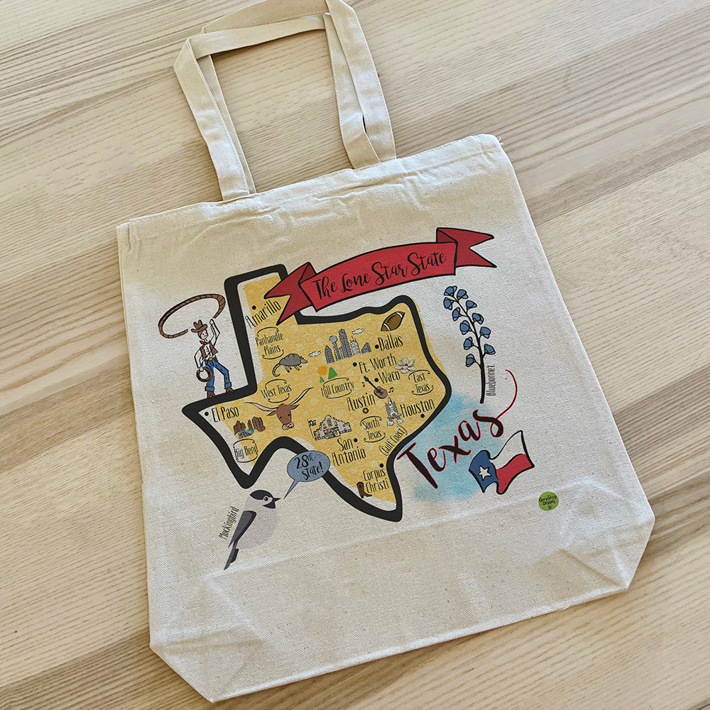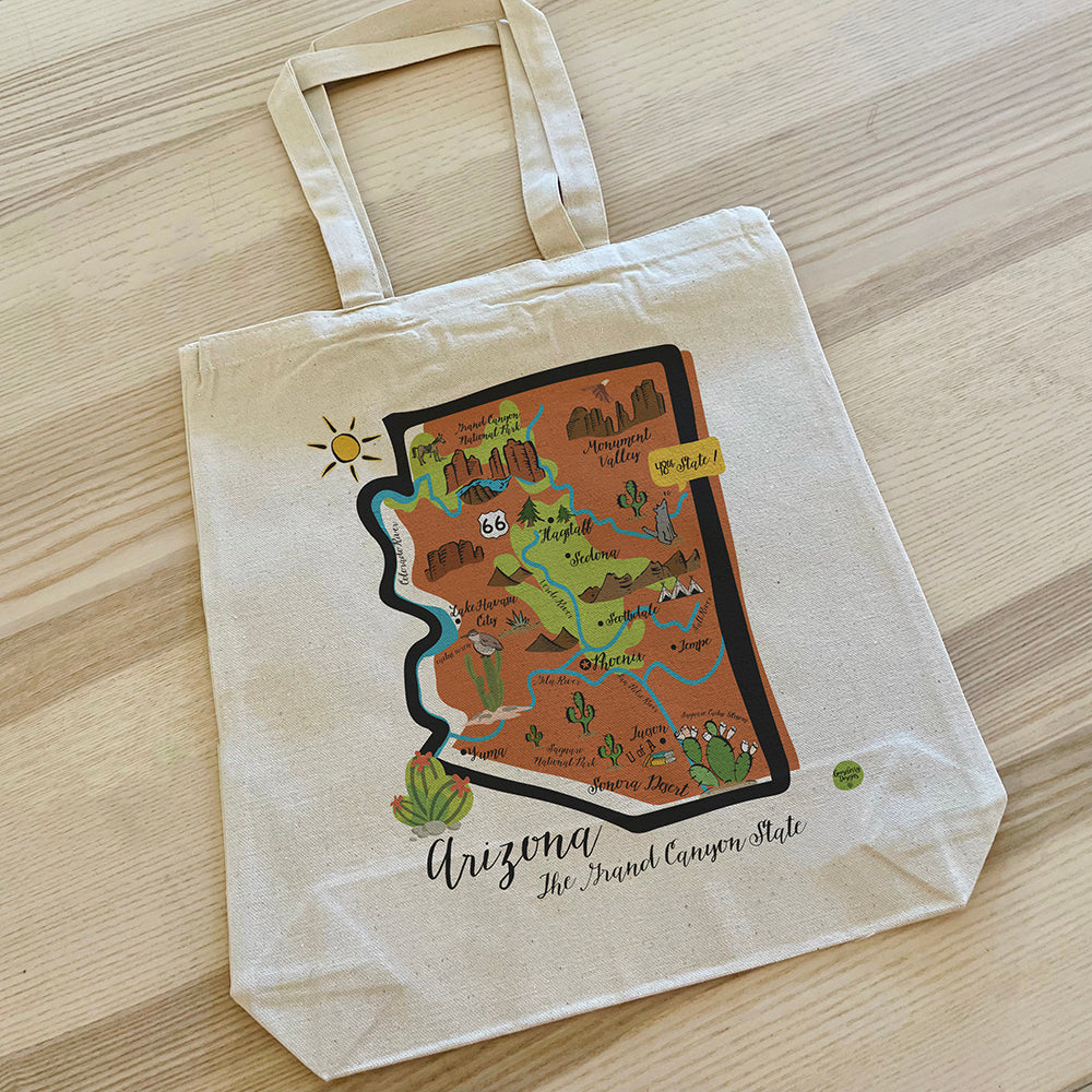 Featuring a signature, hand-drawn, calligraphic state design, this stylish tote is made of 100% organic, natural cotton. It’s ideal for commemorating a memorable vacation, and works wonderfully as a wedding or party favor, corporate gift, or welcome bag.
