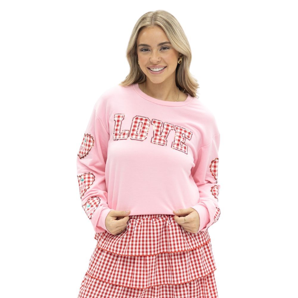 This playful graphic sweatshirt features a soft pink base with bold “LOVE” lettering and coordinating heart details along the sleeves for a standout, feel-good look. Designed with a relaxed fit and cozy fabric, it’s made for easy everyday wear while still feeling special and on-trend.