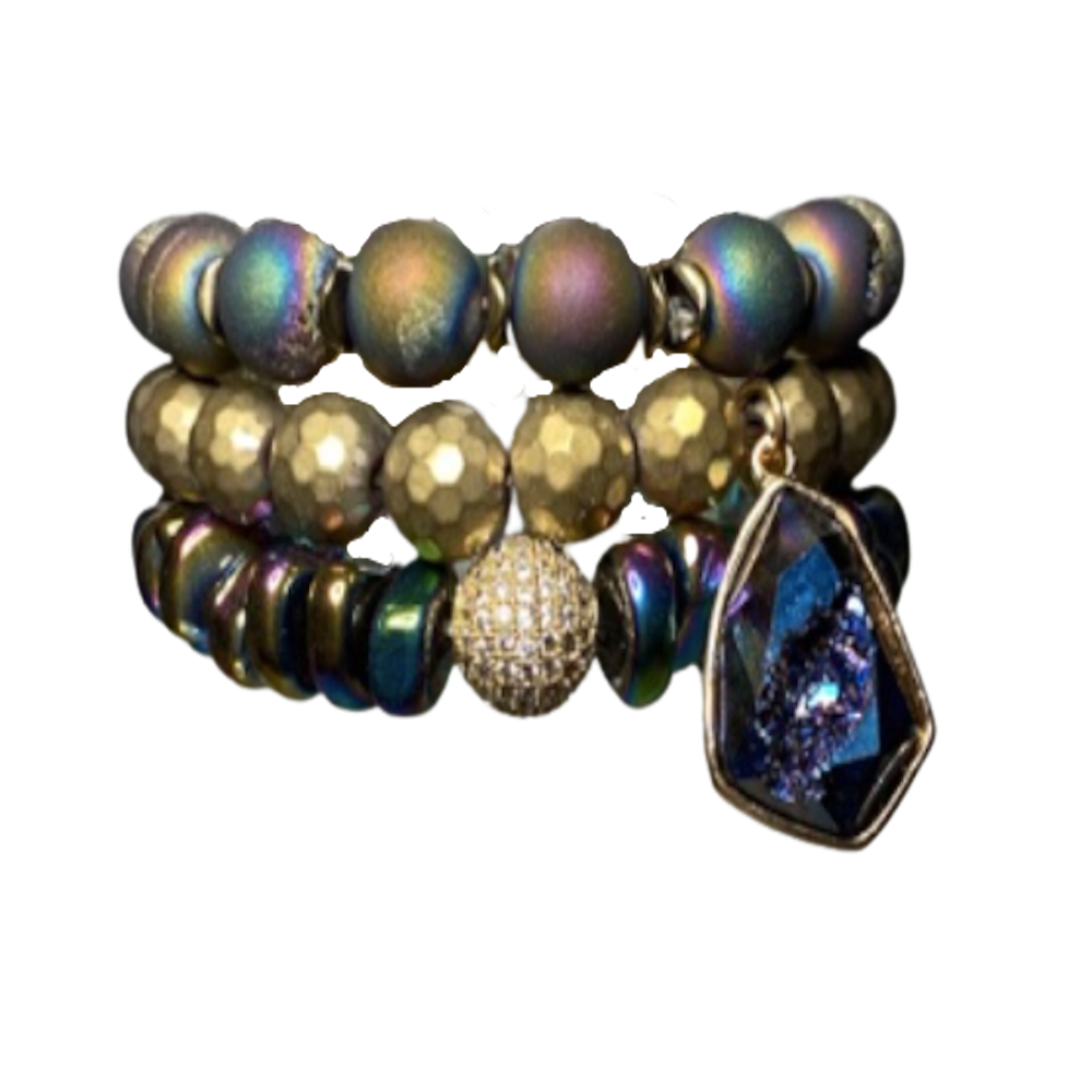 This stack of bracelets is truly unique! With rainbow druzy and hematite, these pieces can add a pop of color to your look.