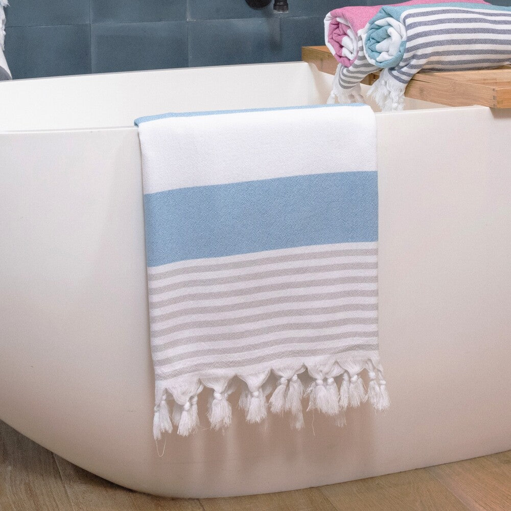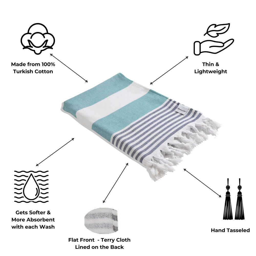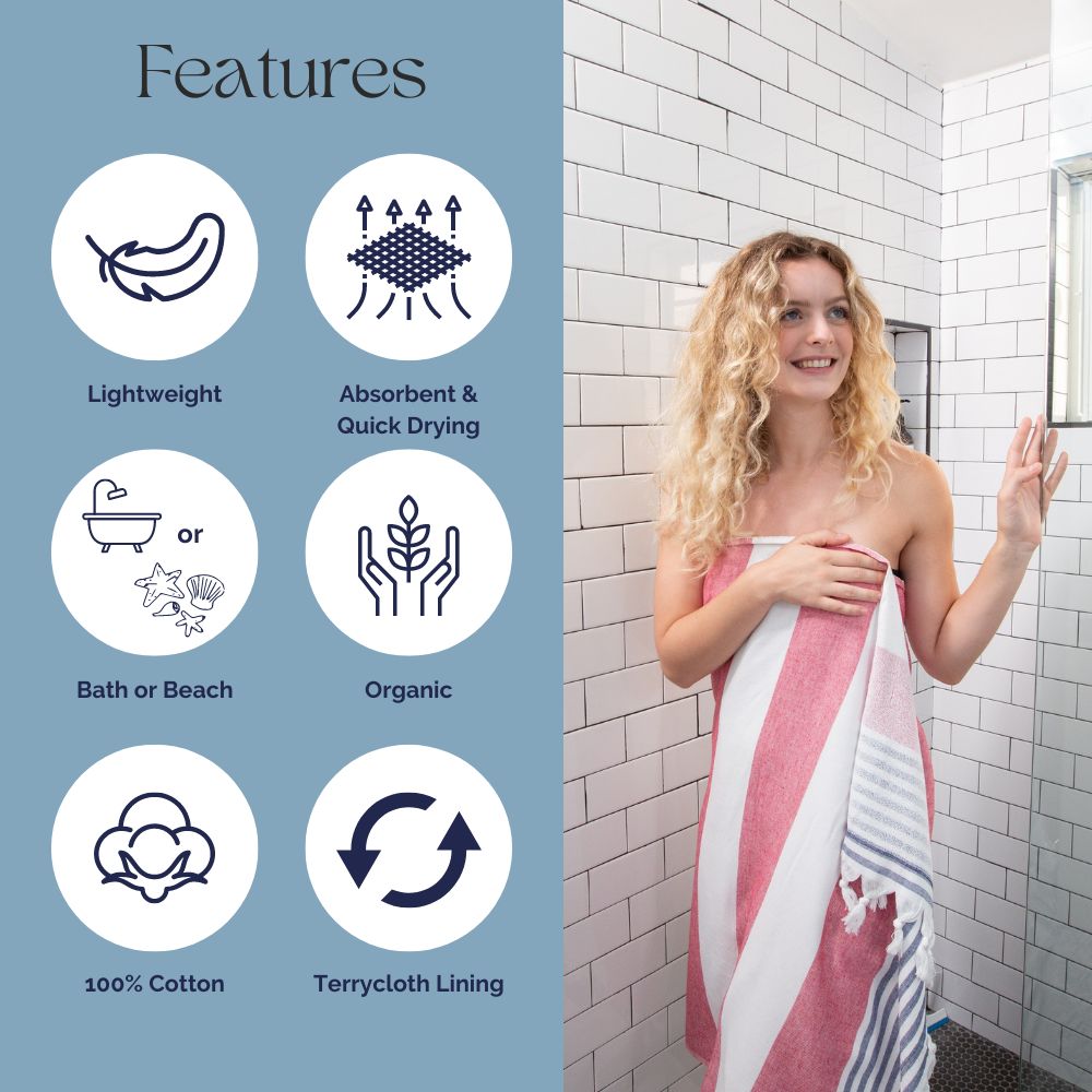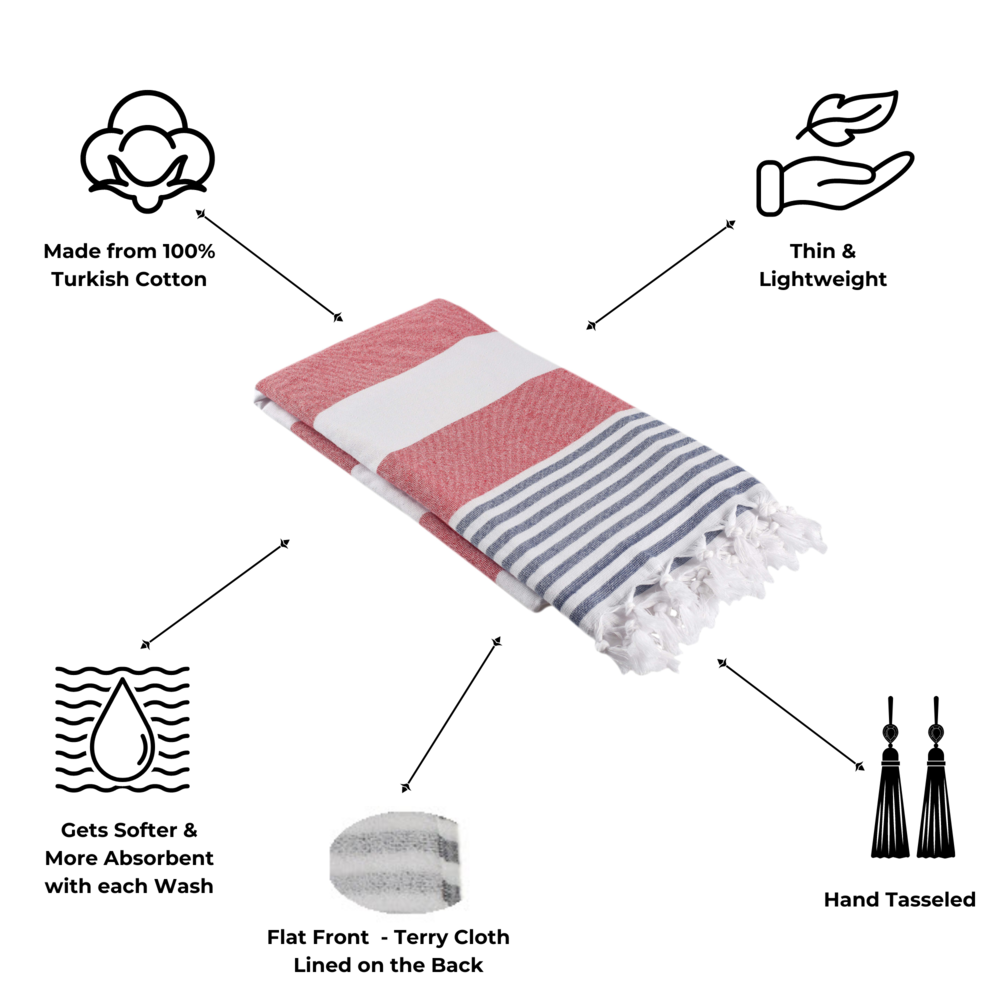 The ideal blend of tradition and comfort, the Marine Turkish Towel features a stylish striped flat-weave front and a soft terry cloth backing. This dual-textured towel brings together the lightweight, quick-drying properties of a classic Turkish towel with the cozy, absorbent qualities of terry cloth. Ideal for everyday luxury, this versatile towel is designed to offer durability and style, whether as a bath towel in your home, at the beach or pool, or on your next adventure!