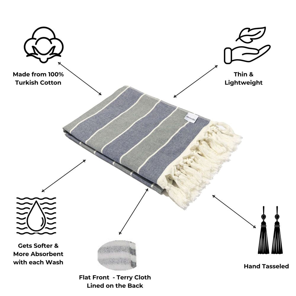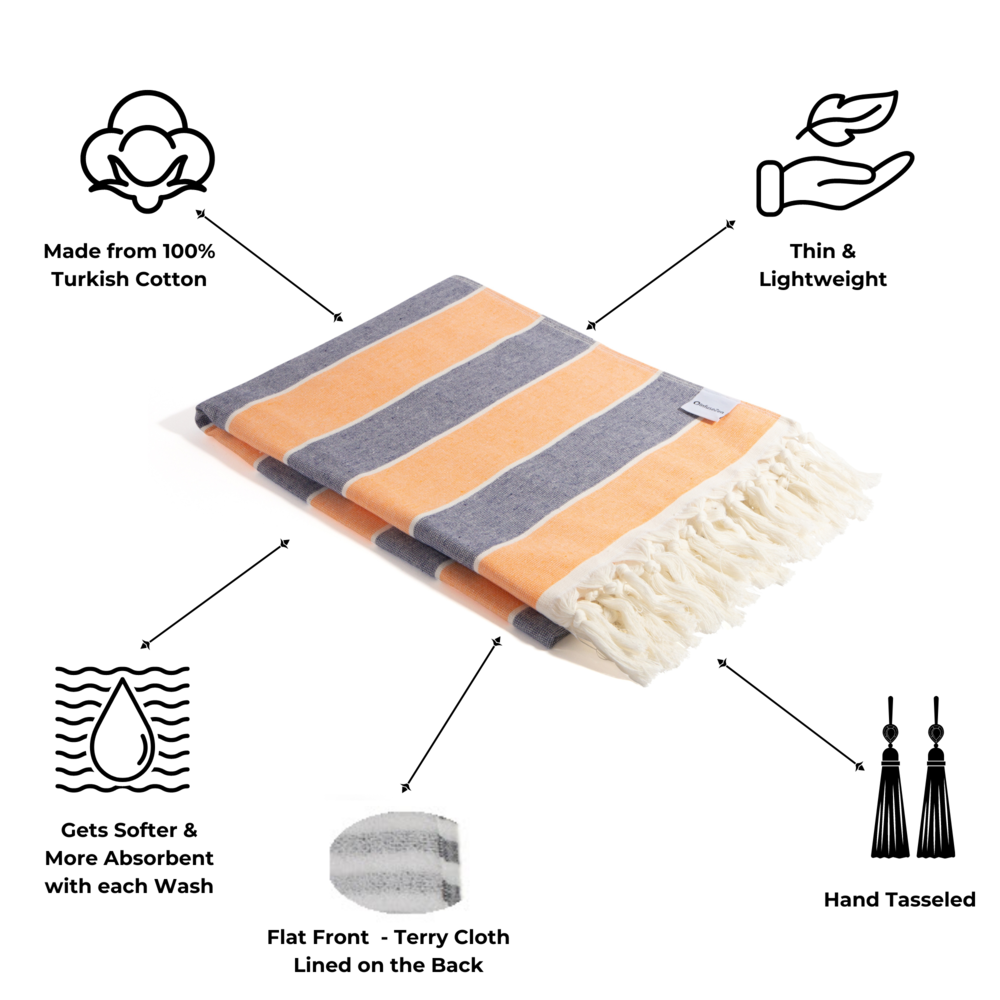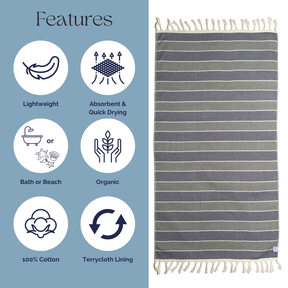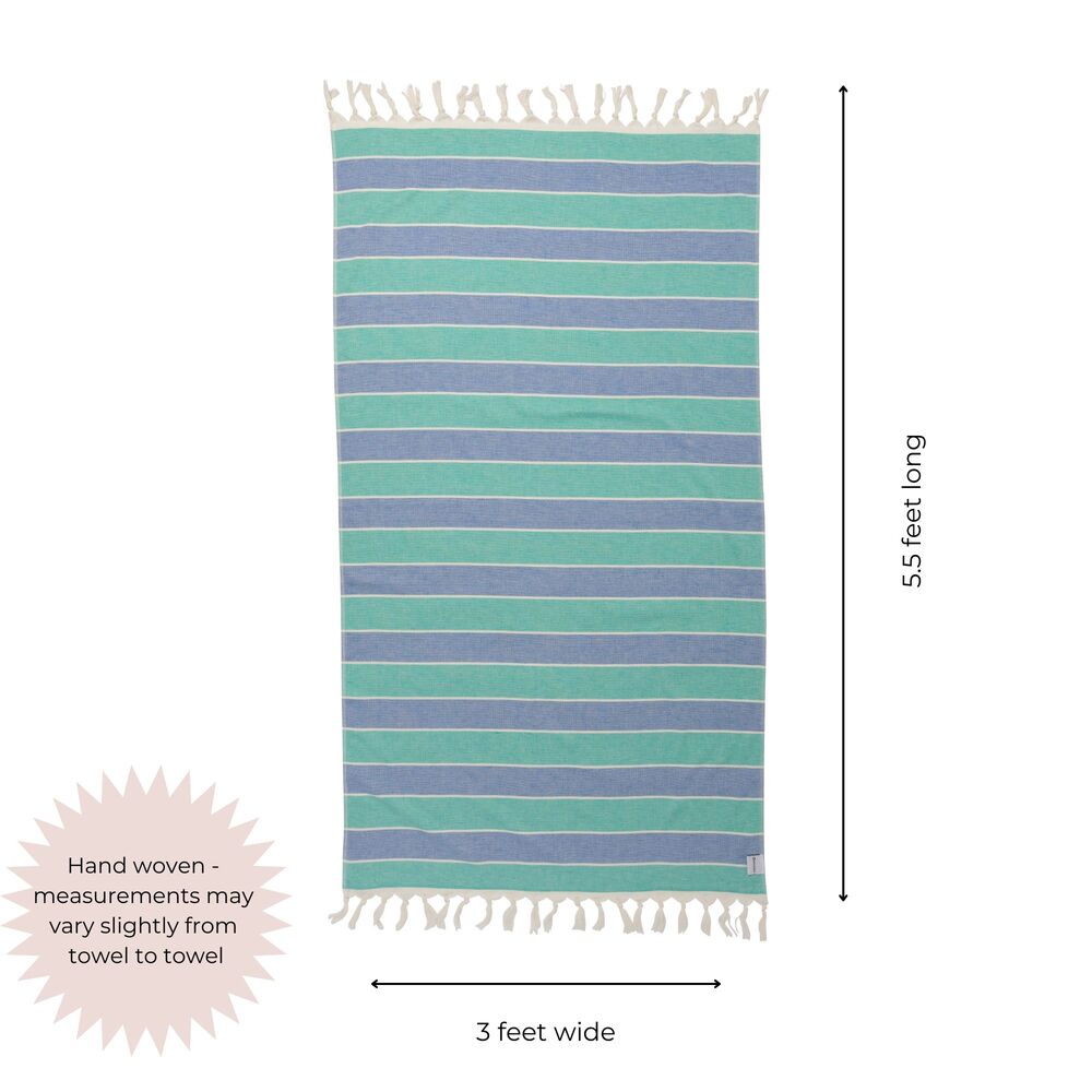 The ideal blend of tradition and comfort, the Multi-Striped Turkish Towel features a stylish striped flat-weave front and a soft terry cloth backing. This dual-textured towel brings together the lightweight, quick-drying properties of a classic Turkish towel with the cozy, absorbent qualities of terry cloth. Great for everyday luxury, this versatile towel is designed to offer durability and style, whether as a bath towel in your home, at the beach or pool, or on your next adventure!