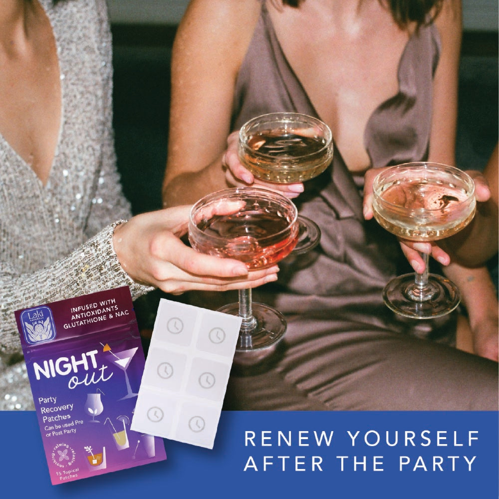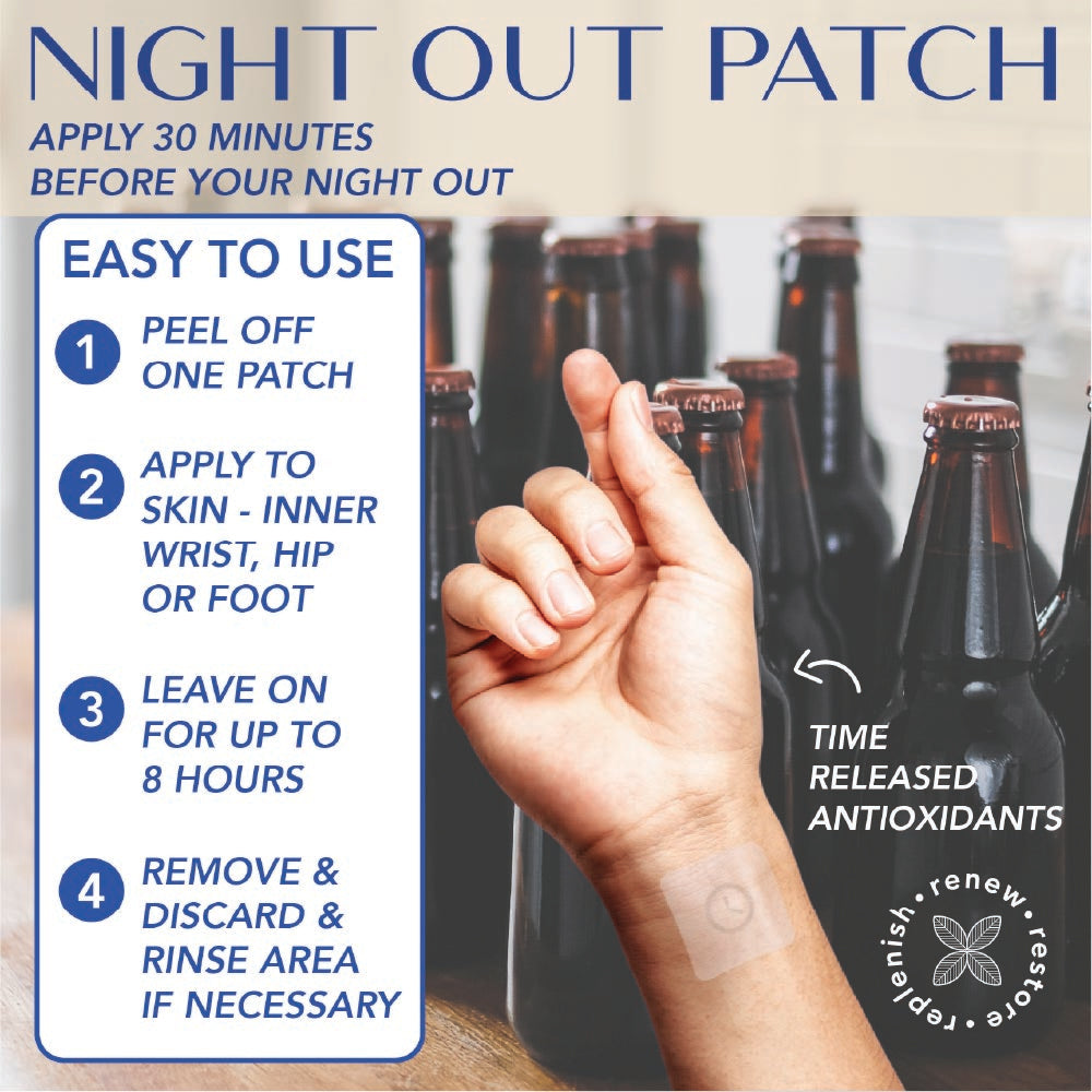 Say goodbye to the nasty symptoms of hangovers! The Night Out Patch is a topical adhesive wellness patch, carefully crafted with powerful antioxidants that help provide a renewing experience after a night out. Designed to support the body's natural detoxification process, this innovative patch harnesses the power of glutathione and N-acetyl cysteine (NAC) to help regain balance and vitality.