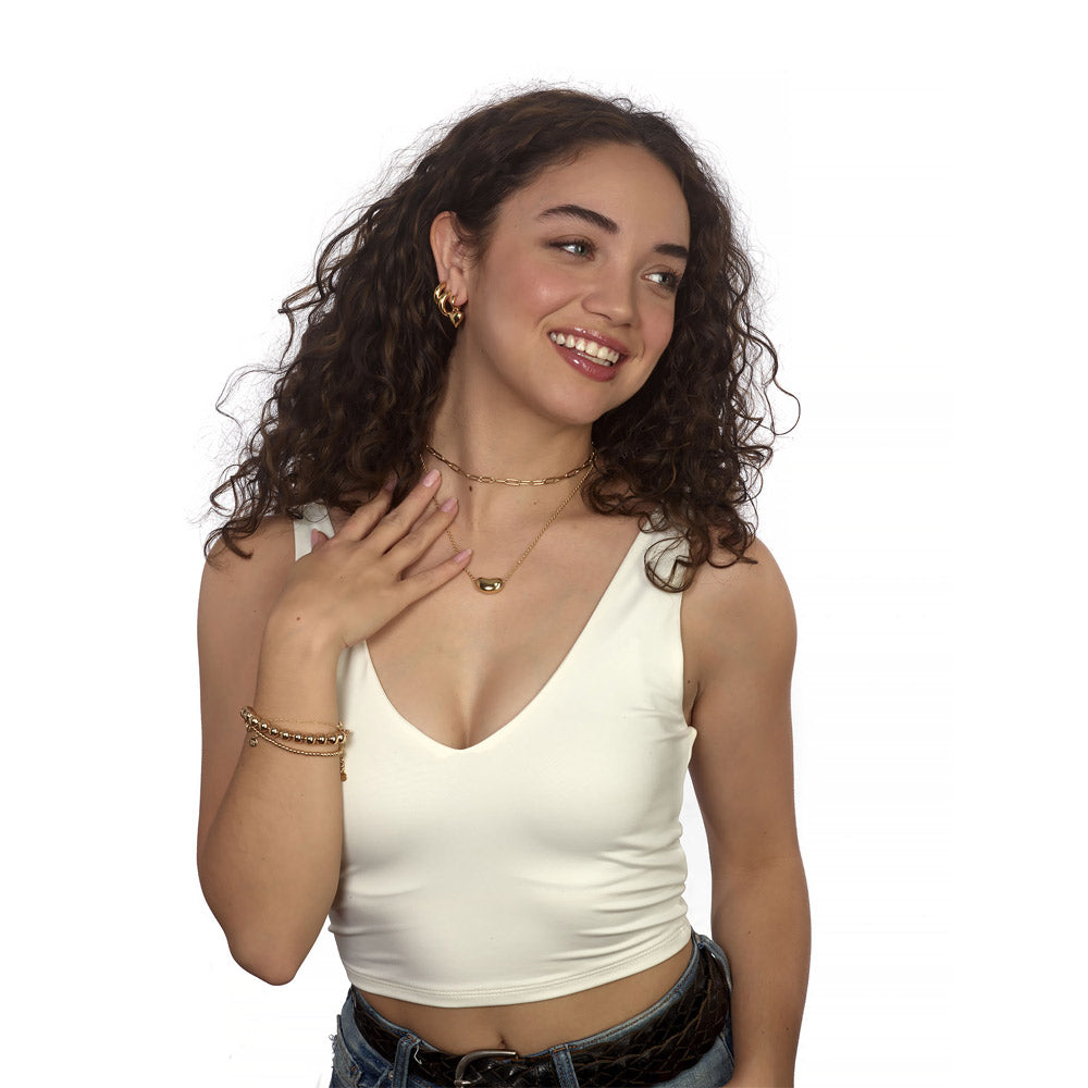 The Moonbean Necklace is a romantic blend of elegance and charm, featuring an oblong bean with an off-center stone on a delicate rolo chain—a modern, yet timeless piece.