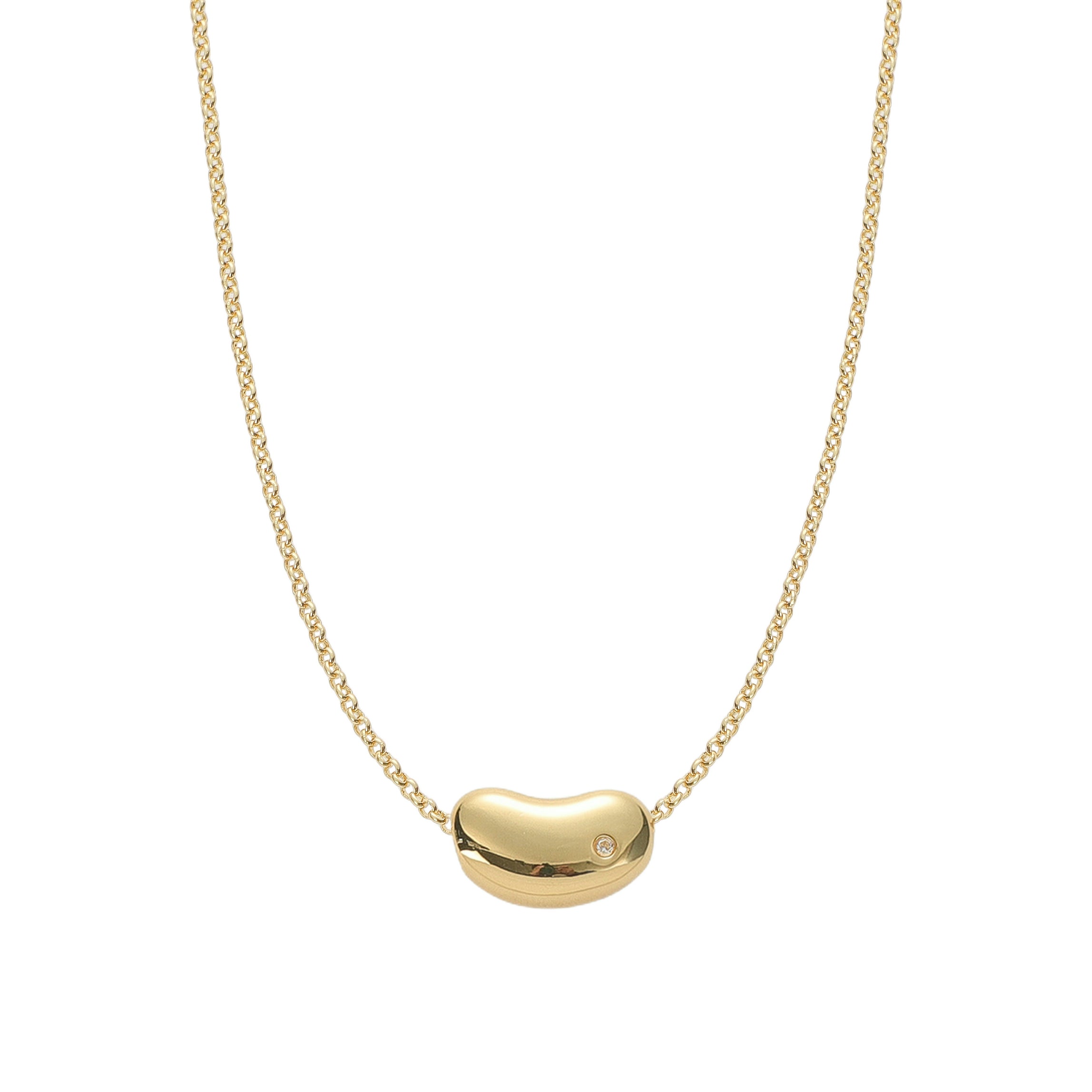 The Moonbean Necklace is a romantic blend of elegance and charm, featuring an oblong bean with an off-center stone on a delicate rolo chain—a modern, yet timeless piece.