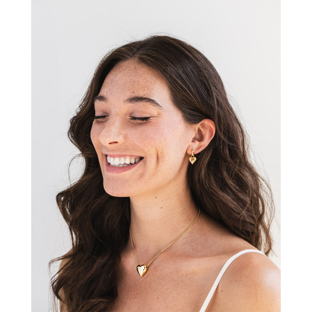 The Sweetheart Dangle Earrings are chic, gold-plated huggies with a playful heart drop—flirty, modern, and effortlessly cool.