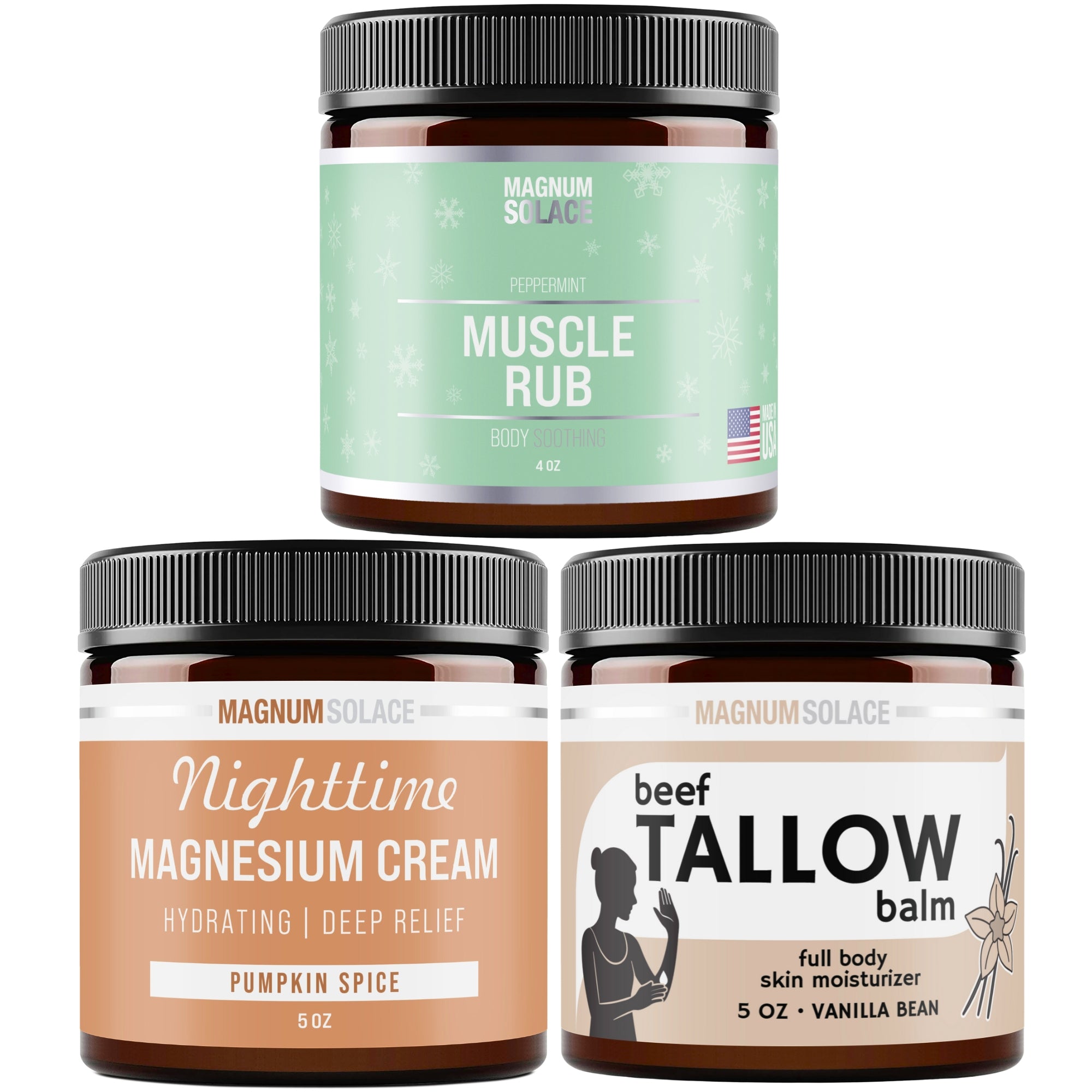 The latest skincare to harness natural elements in a variety of seasonal scents. This bundle includes calming topical magnesium, peppermint-infused cream to relieve stiff muscles, and beef tallow for deep moisturization all over your body.