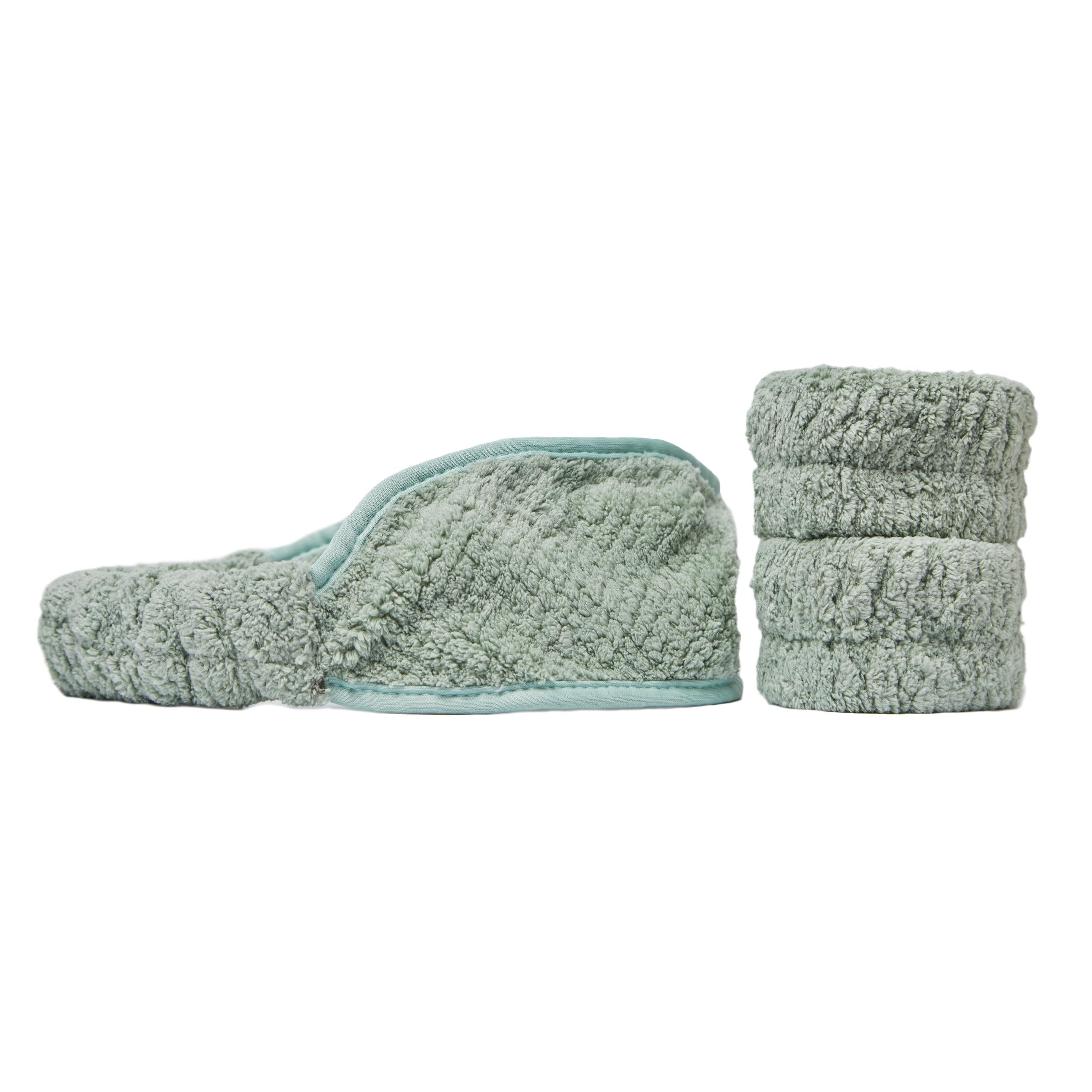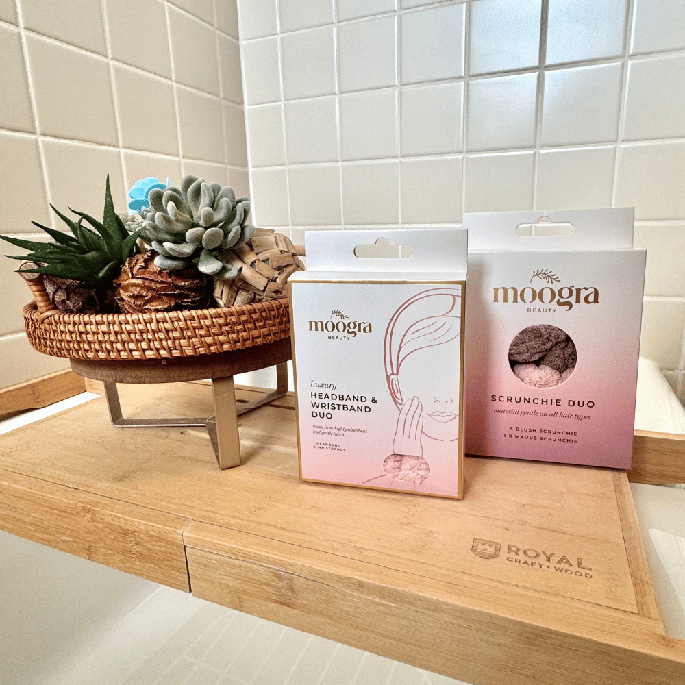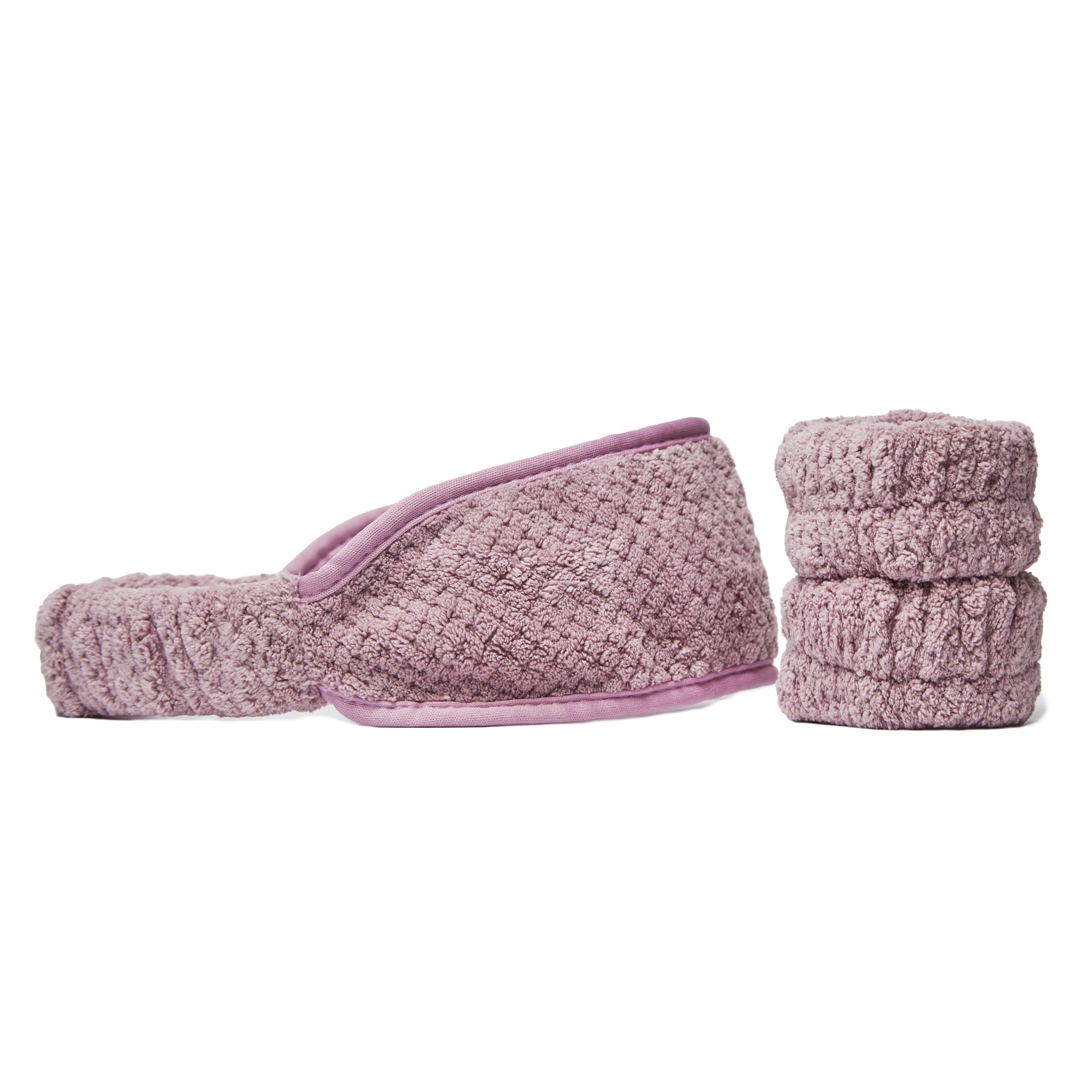 This plush headband is a great all-purpose accessory to use during your skincare routine, spa days, or makeup application. Paired with elasticated wristbands that are ideal to use when cleansing to capture excess water from running down your arms, keeping your basin clean.