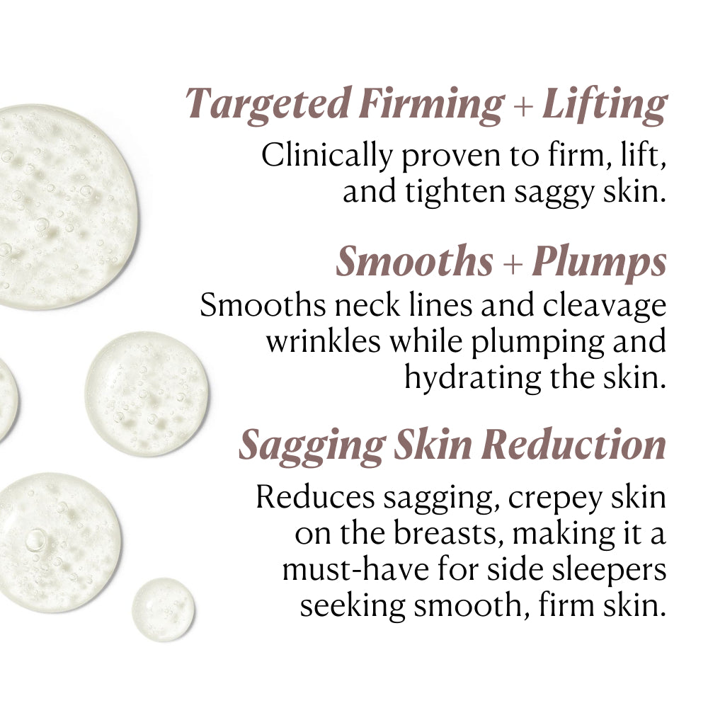 Powerful lifting and firming where you want it most. Concentrated Firming Neck + Dec Serum is an ultra-potent formula with double the actives to plump, lift, and smooth the thinnest skin—neck, cleavage, and bust—where it’s needed most. Designed to tighten loose, sagging skin, it helps visibly firm, soften lines, reduce crepiness, and restore a youthful-looking contour. A side sleeper’s best friend.
