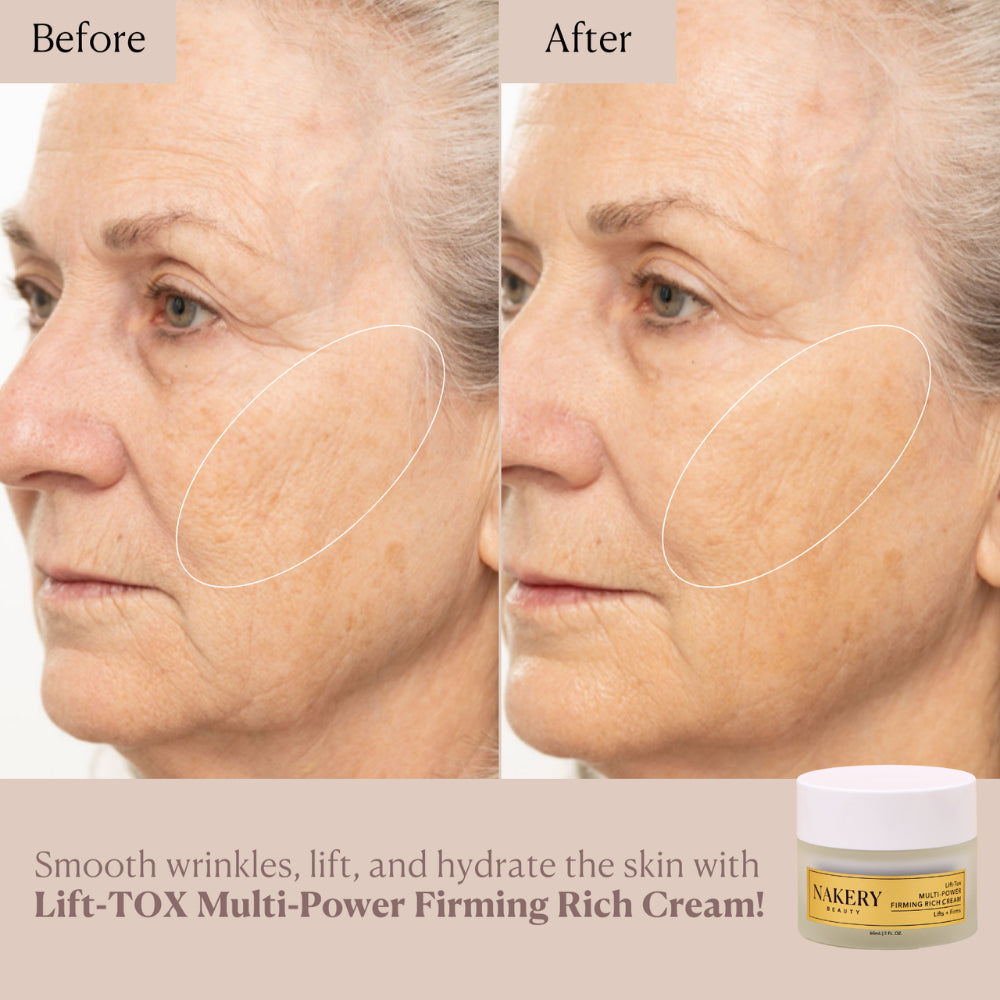 Achieve visibly younger-looking skin in just days. Lift-Tox Multi-Power Firming Rich Cream is formulated to deliver instant, long-term lifting and tightening. Its memory foam texture helps snap sagging skin back into place while peptides work to smooth wrinkles and prevent new ones—your fountain of youth in a jar.