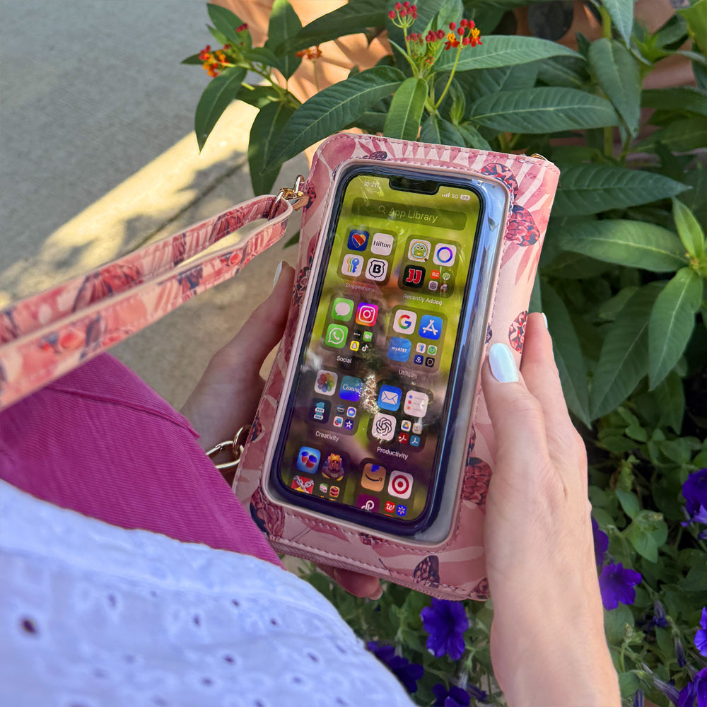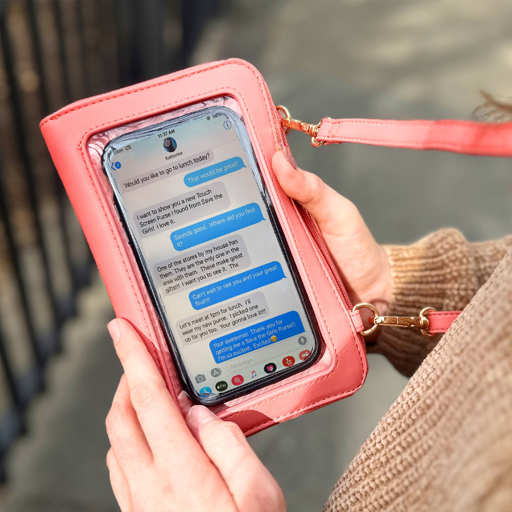 The Captiva Touch Screen Purse allows you to text, answer your phone, and perform other smartphone functions while your phone is safe and secure inside your purse. It combines functional design with elegant styling, featuring a roomy main compartment, change pocket, credit card slots, and front pocket for readers, sunglasses, and more!