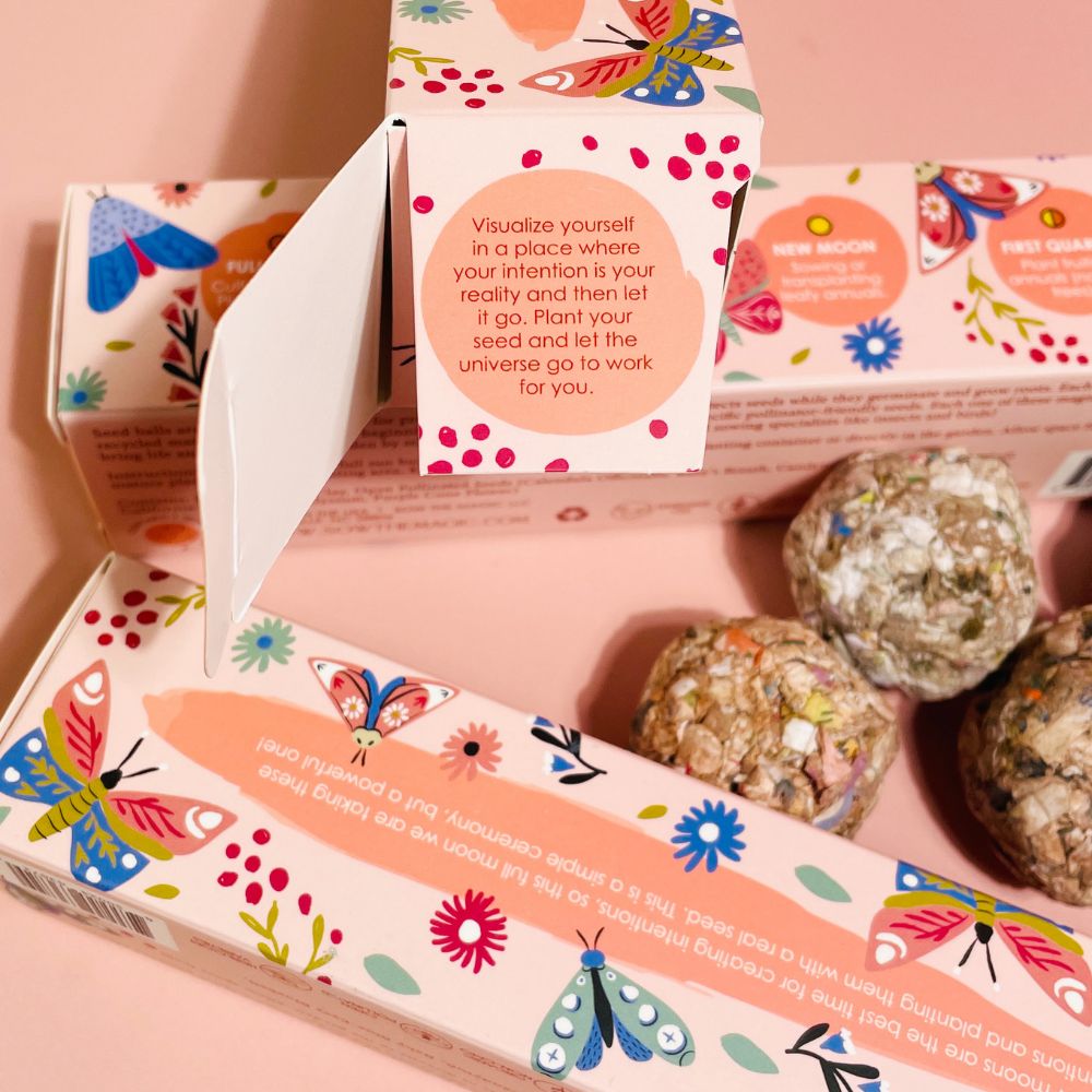 Align your garden with the magic of the moon. This trio of seed ball planting sets features a handpicked assortment of flowers and herbs, thoughtfully designed to harmonize your gardening practice with the natural rhythm of the lunar cycle. Each set brings intention, beauty, and a touch of ritual to your growing space, whether planted in pots or directly in the earth.