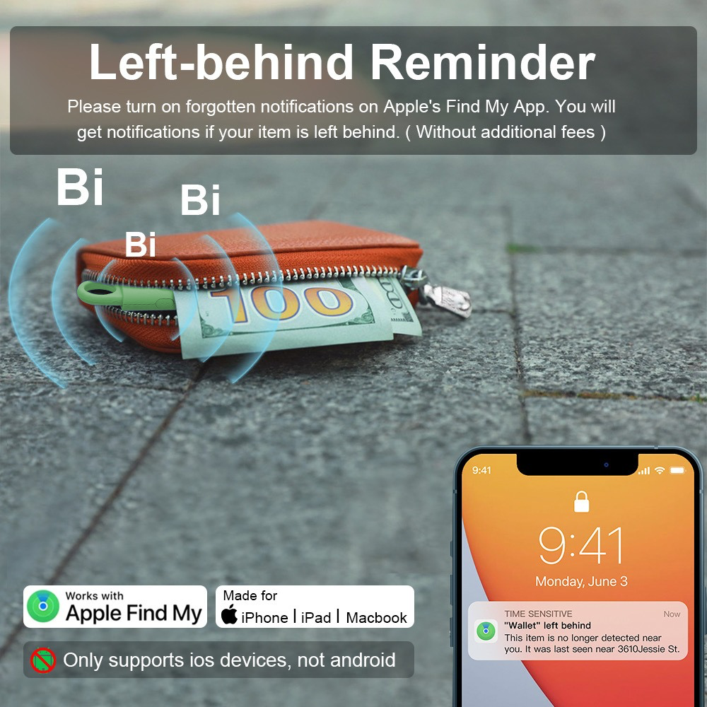 • Syncs with the Apple Find My app to track item (only compatible with iOS devices):