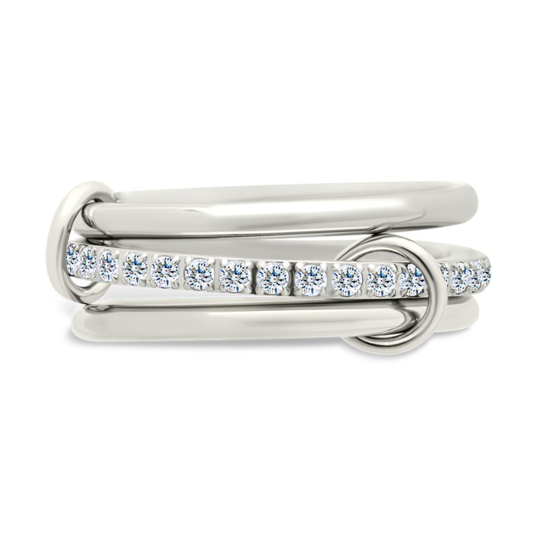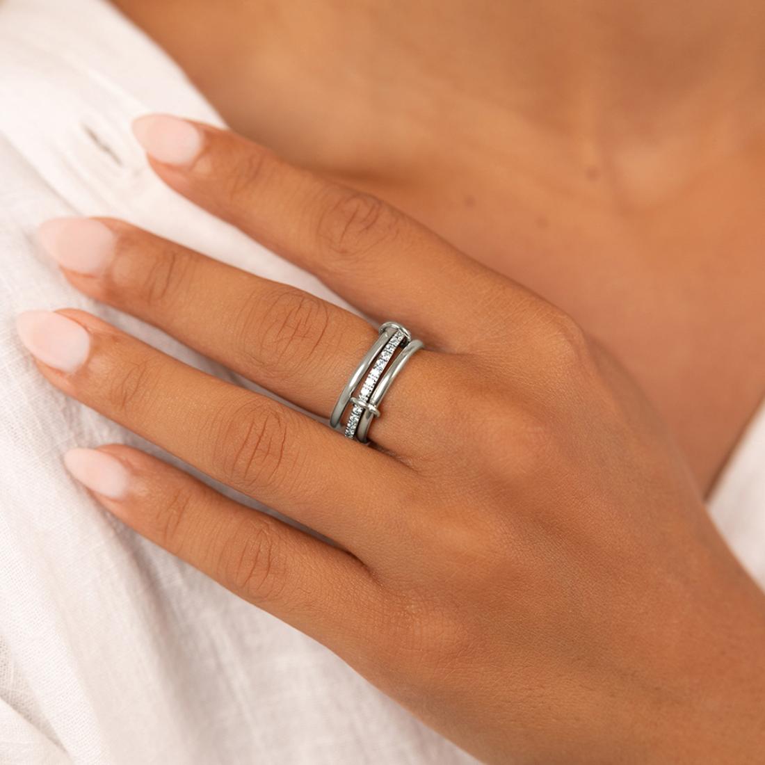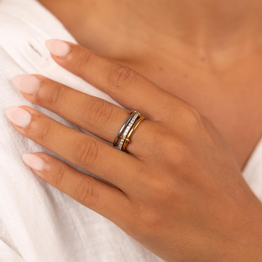Architectural, but wearable. This ring layers clean lines with a hint of edge—featuring sleek silver curves and a center row of baguette-cut cubic zirconia stones. Your everyday stack, reimagined.