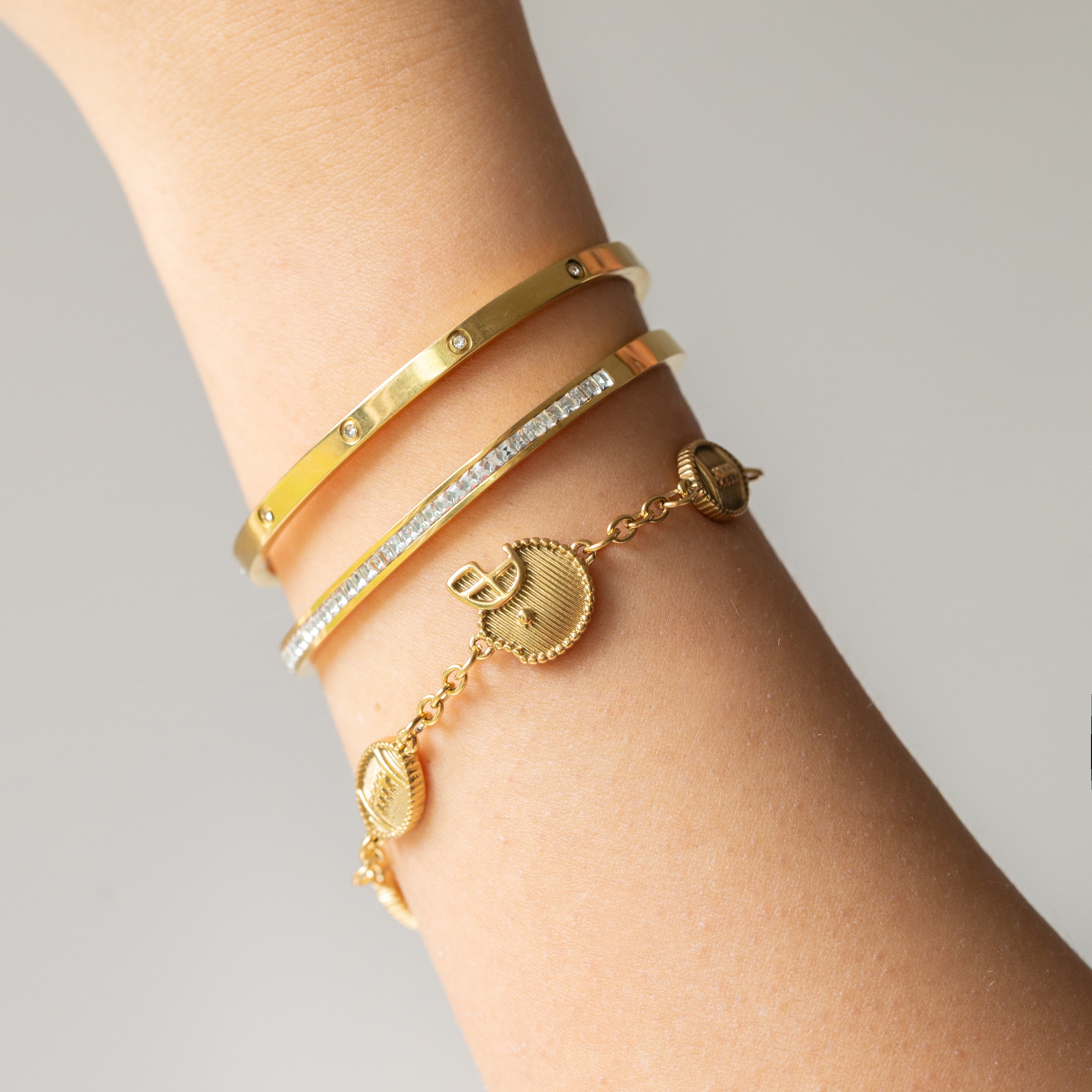 A touchdown for your style! Score big with this Football Fever Bracelet Stack—the ideal blend of sporty flair and delicate style. Crafted with gleaming gold and a standout football charms, this piece adds a touch of class to game day and beyond. Whether you’re cheering from the stands or showing off your team pride every day, it’s the ultimate accessory for fans who love to shine.