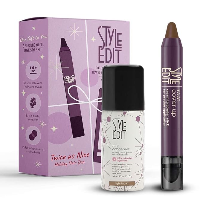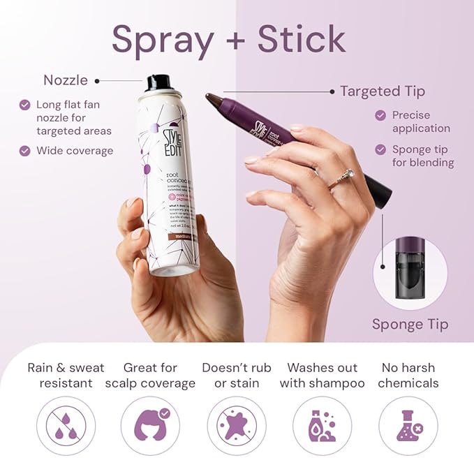 Refresh your roots anytime, anywhere with the Root Cover-Up Stick and Concealer Spray Duo, designed for fast, effective gray coverage and color touch-ups. This powerful pair features a spray for wide-area application and dual-ended stick for precise blending at the hairline, temples, or eyebrows. Both products are lightweight, transfer-resistant, and easily washable, making them ideal for busy days, last-minute events, or everyday maintenance between salon visits.