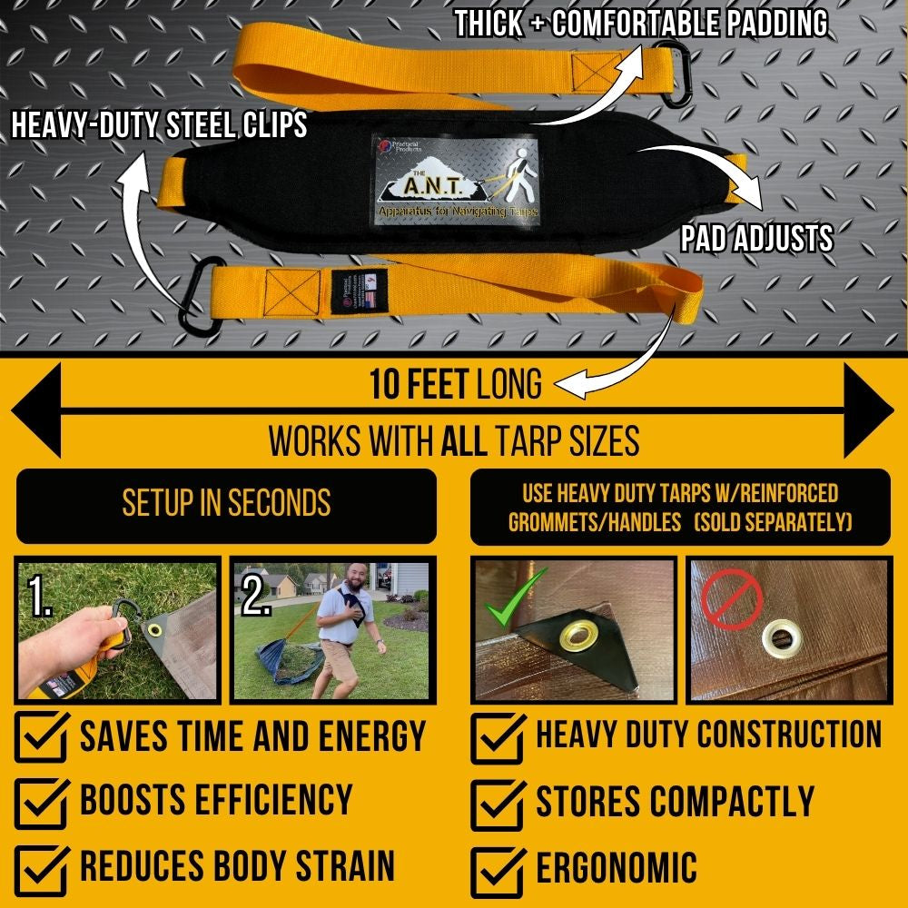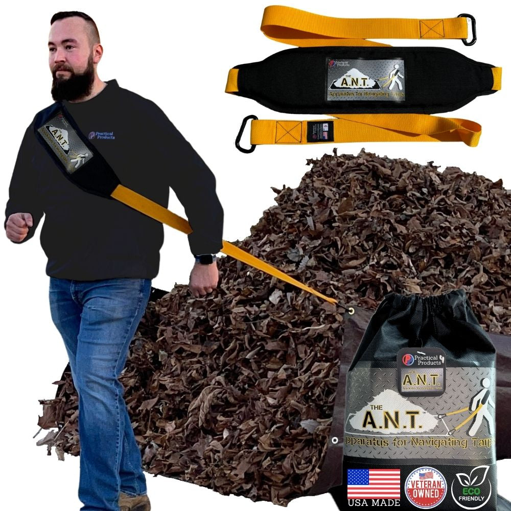 Do you or a loved one struggle with cleaning up the yard every season? This year, take the hard work out of yard work with The A.N.T., a heavy duty padded strap that clips into the grommets of a tarp, making your fall cleanup faster, safer, and easier.