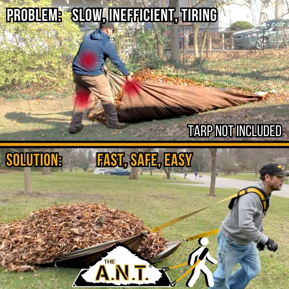 The A.N.T. is a padded strap that clips into the grommets of a tarp, making yard work faster, safer, and easier. We've engineered the most efficient and ergonomic solution for all of your fall cleanup needs.