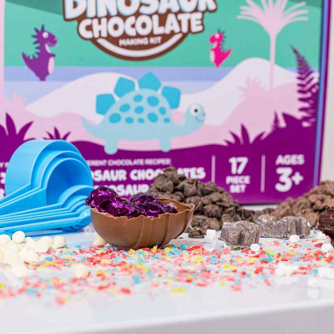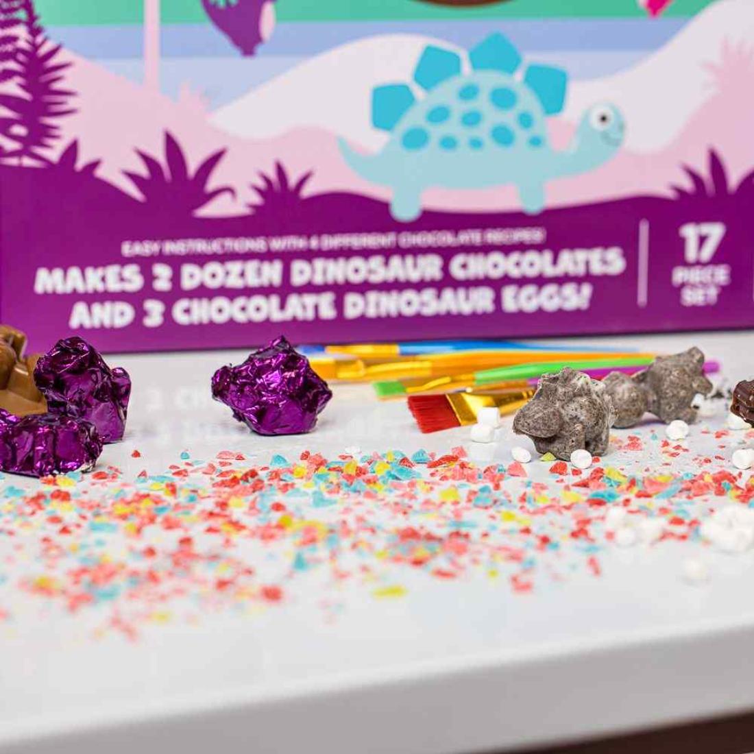 A full at-home baking experience for kids! This complete kit is designed for you to make two dozen dinosaur-shaped chocolates and three large chocolate dinosaur eggs from scratch. Get ready for a dino-mite time!