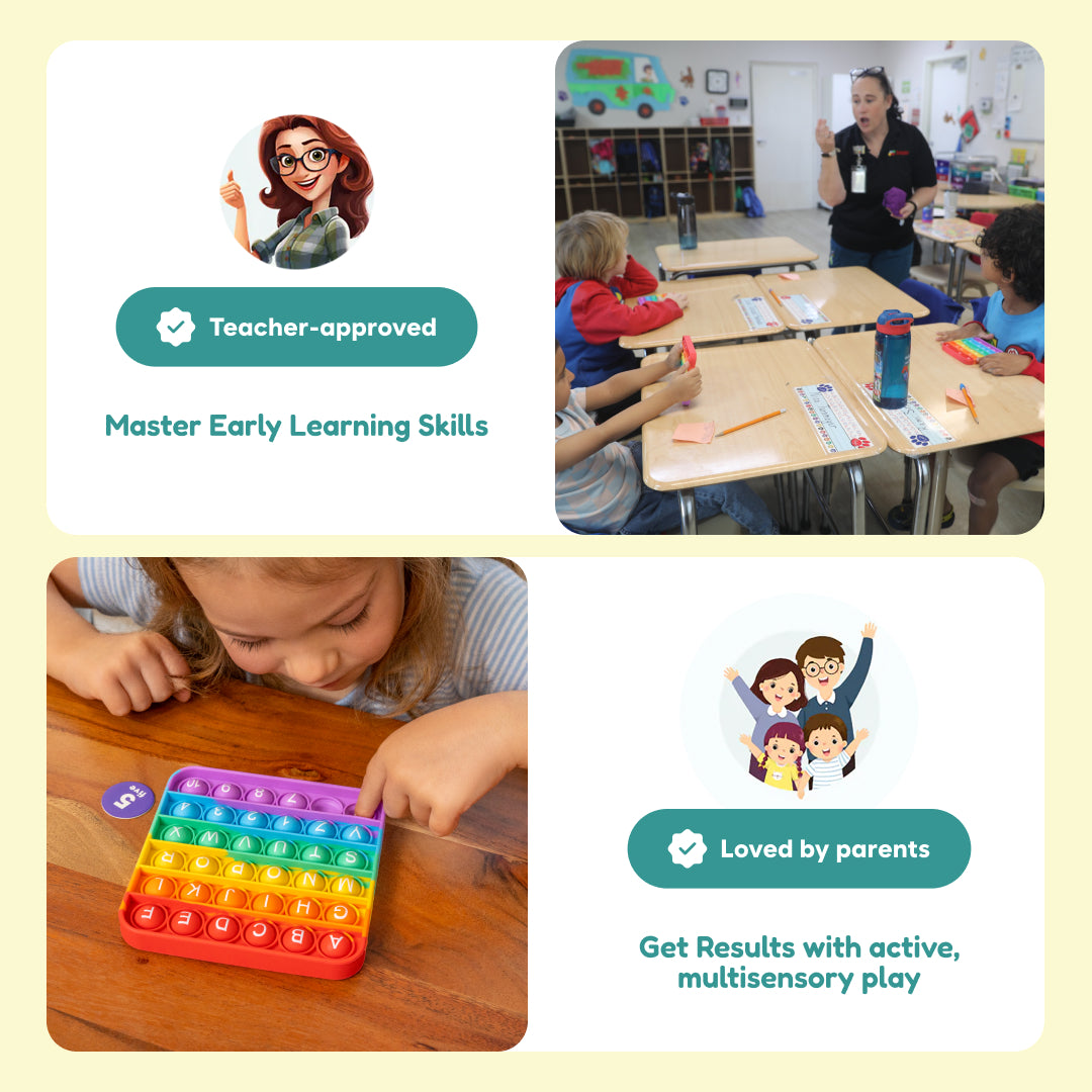 ABC Bingo! combines the excitement of bingo with foundational early literacy skills. Children learn letters, numbers, colors, and counting through interactive fidget mats and tokens. This game supports Pre-K and Kindergarten learners in a fun, hands-on way that keeps them engaged.