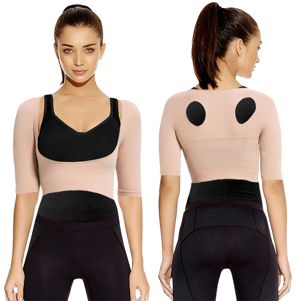 This compression garment features slimming sleeves and shoulder support that gently guides shoulders back into proper posture.