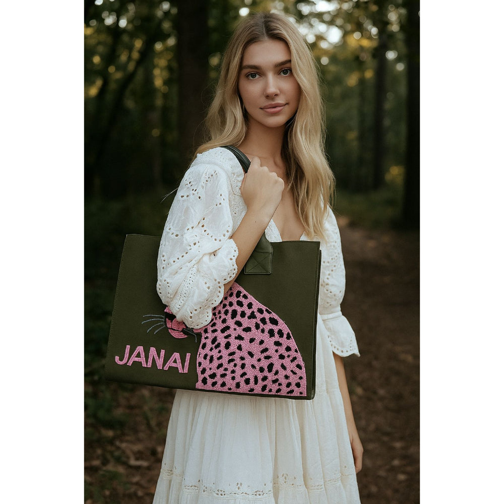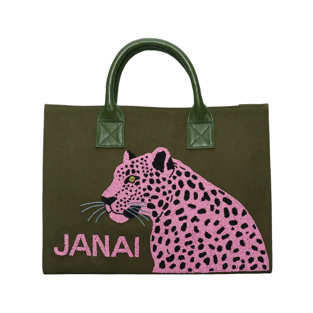 A made-to-order, hand-beaded canvas tote with a stylish cheetah design. This bag is fun and colorful, can be personalized, and is sure to be a head-turner!