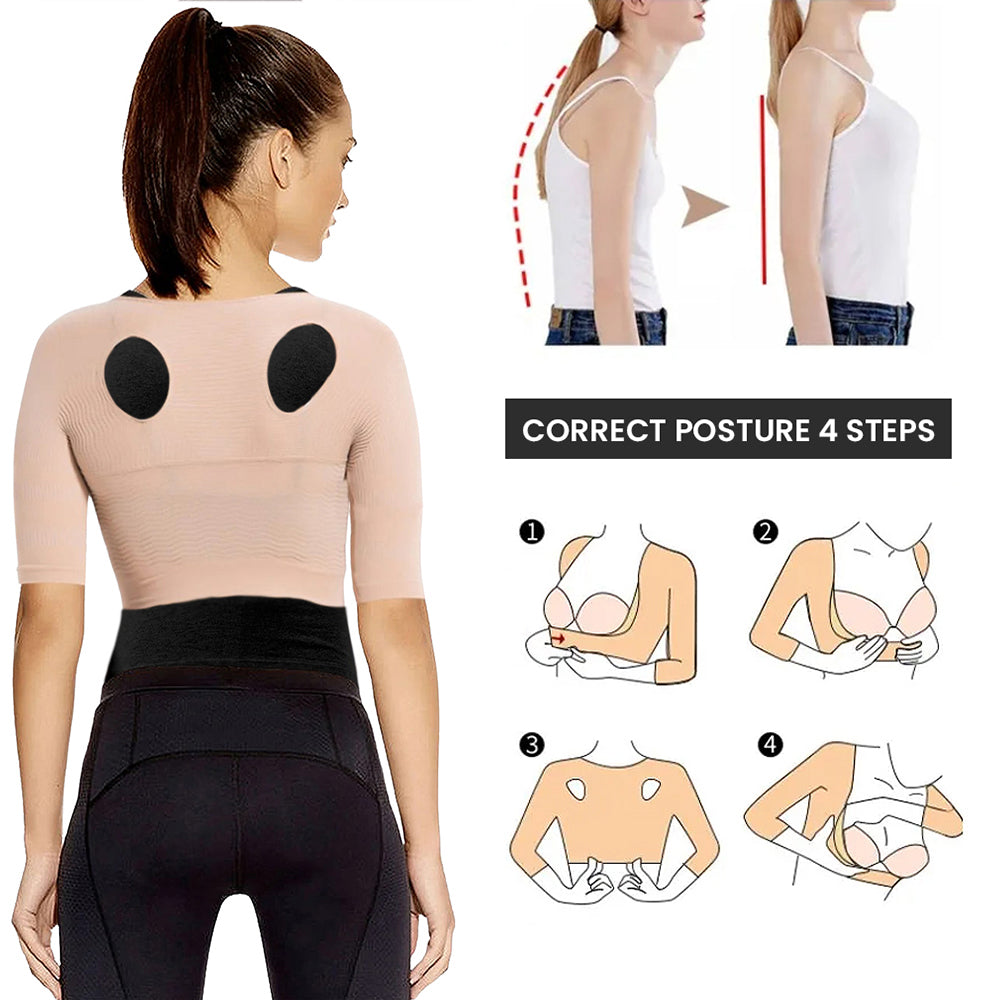 This compression garment features slimming sleeves and shoulder support that gently guides shoulders back into proper posture.