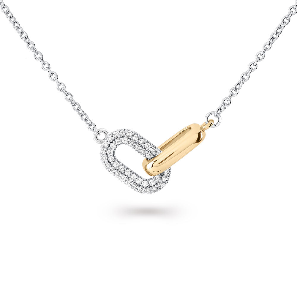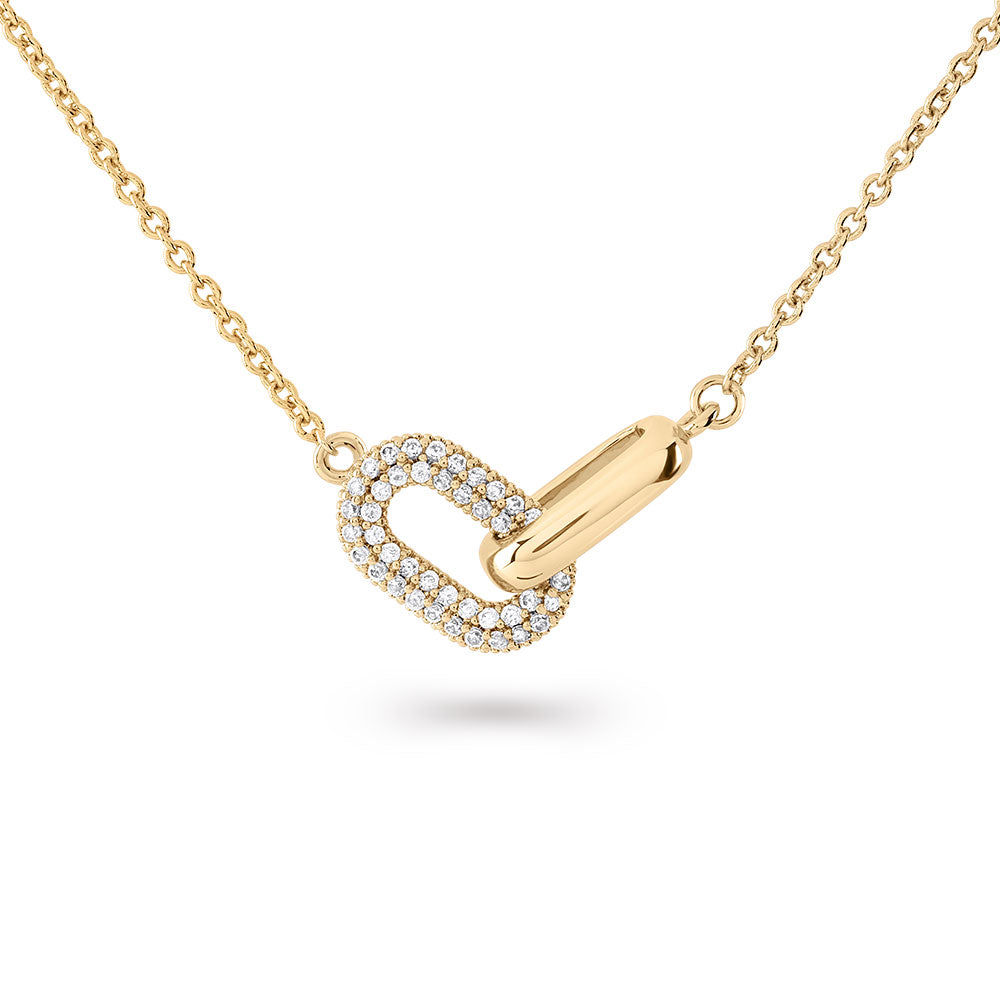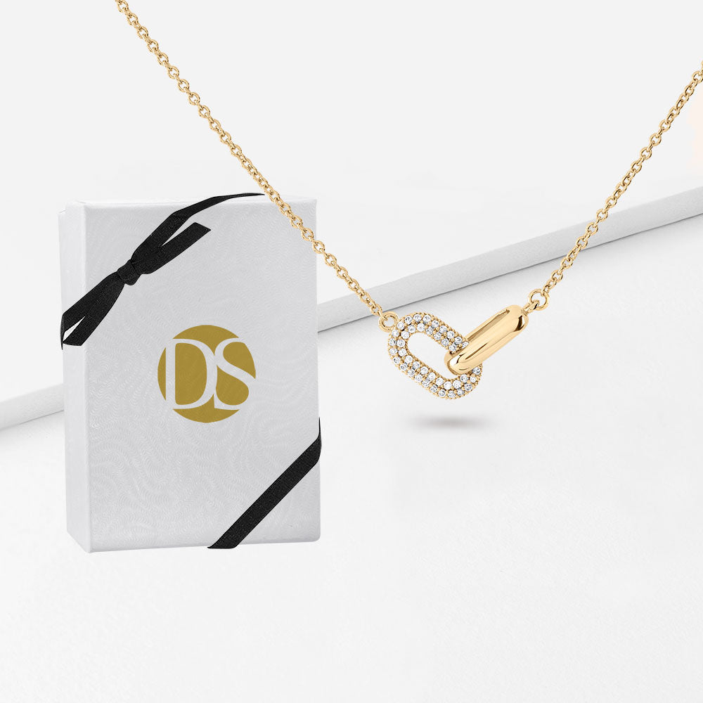 Shine bright with the Dare to Dazzle Pavé Link Pendant Necklace. Featuring a stunning pavé link pendant, this necklace catches the light with every movement, adding a touch of glamour and sophistication to any look. Ideal for making a statement, its bold design effortlessly combines elegance with modern sparkle.