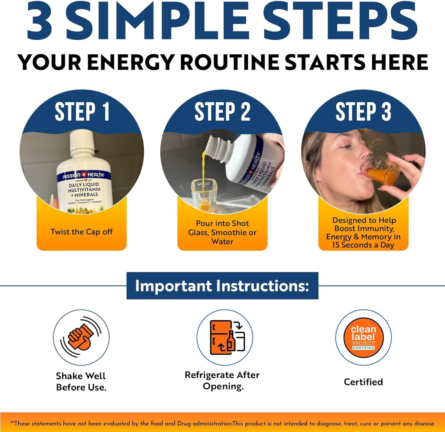 A daily supplement made with high-grade ingredients. This liquid supplement is packed with nutritious ingredients to replace your hard-to-swallow vitamin pills. Make your health a priority in only 30 seconds a day!