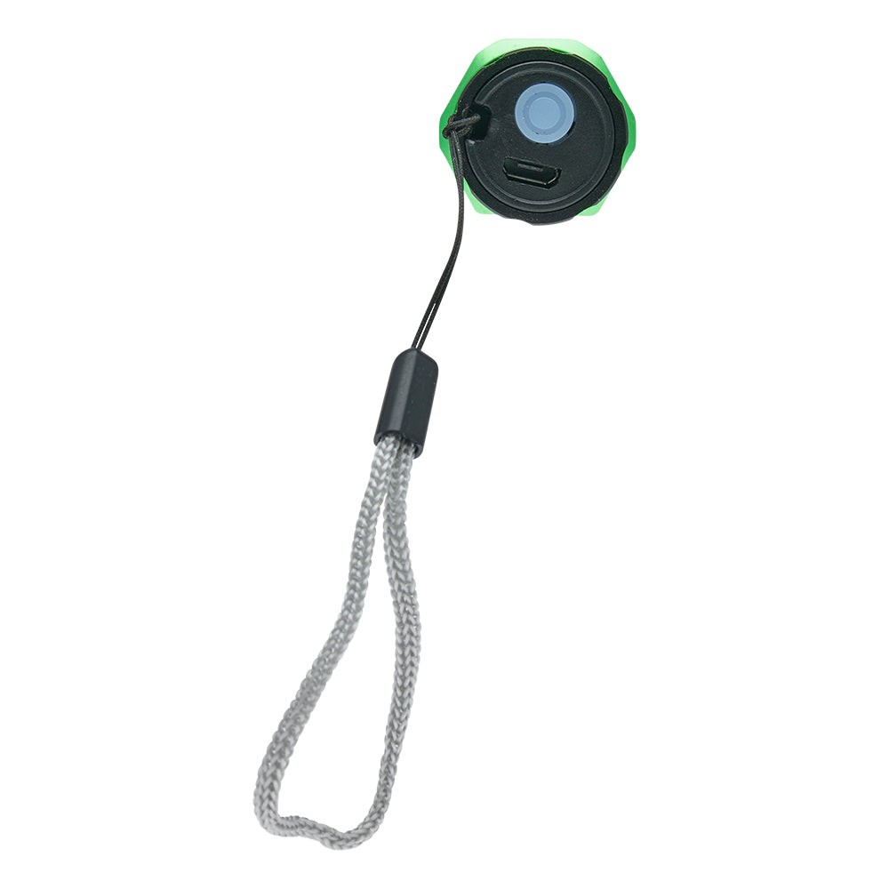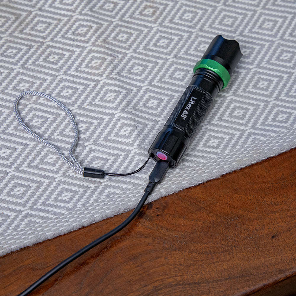 • Plug the large connector of the included charging cable into any USB power source, such as a power cube, computer, or car charger. Plug the other end into the charging port located at the base of the flashlight