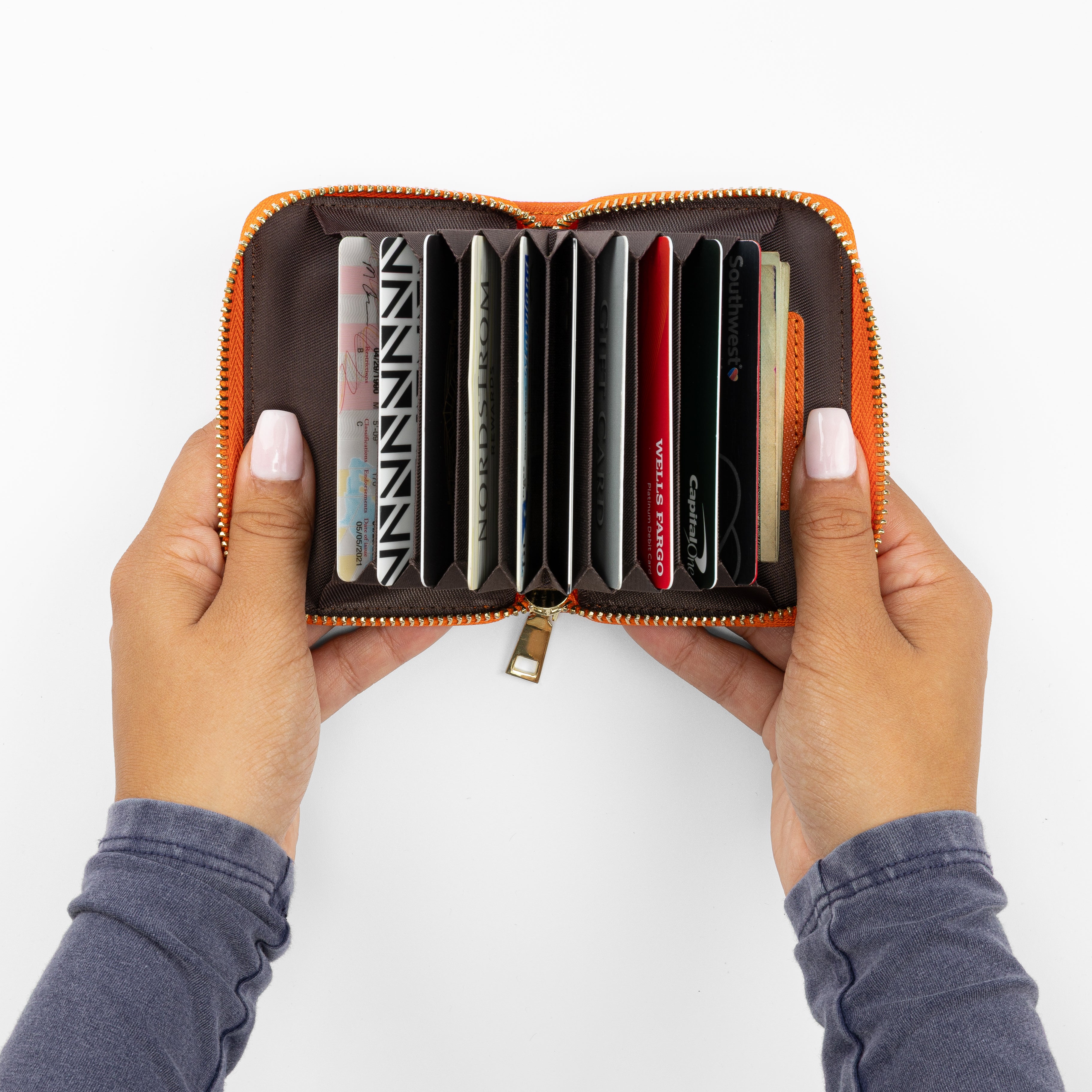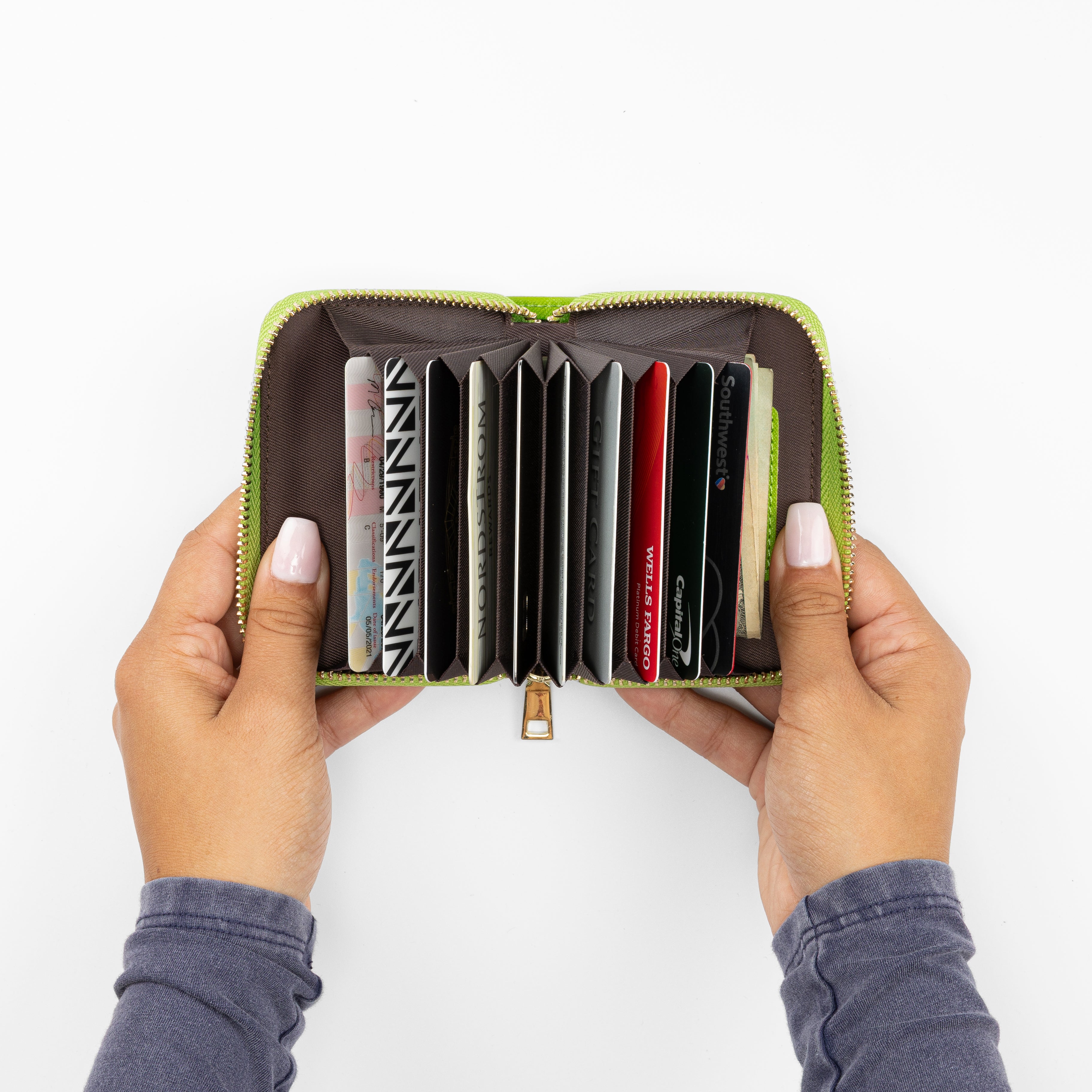 With room for up to ten cards, this accordion-style wallet closes neatly, even when at full capacity. Smartly designed to store both cards and folded bills, it's a colorful and compact way to carry just what you need when traveling lightly.