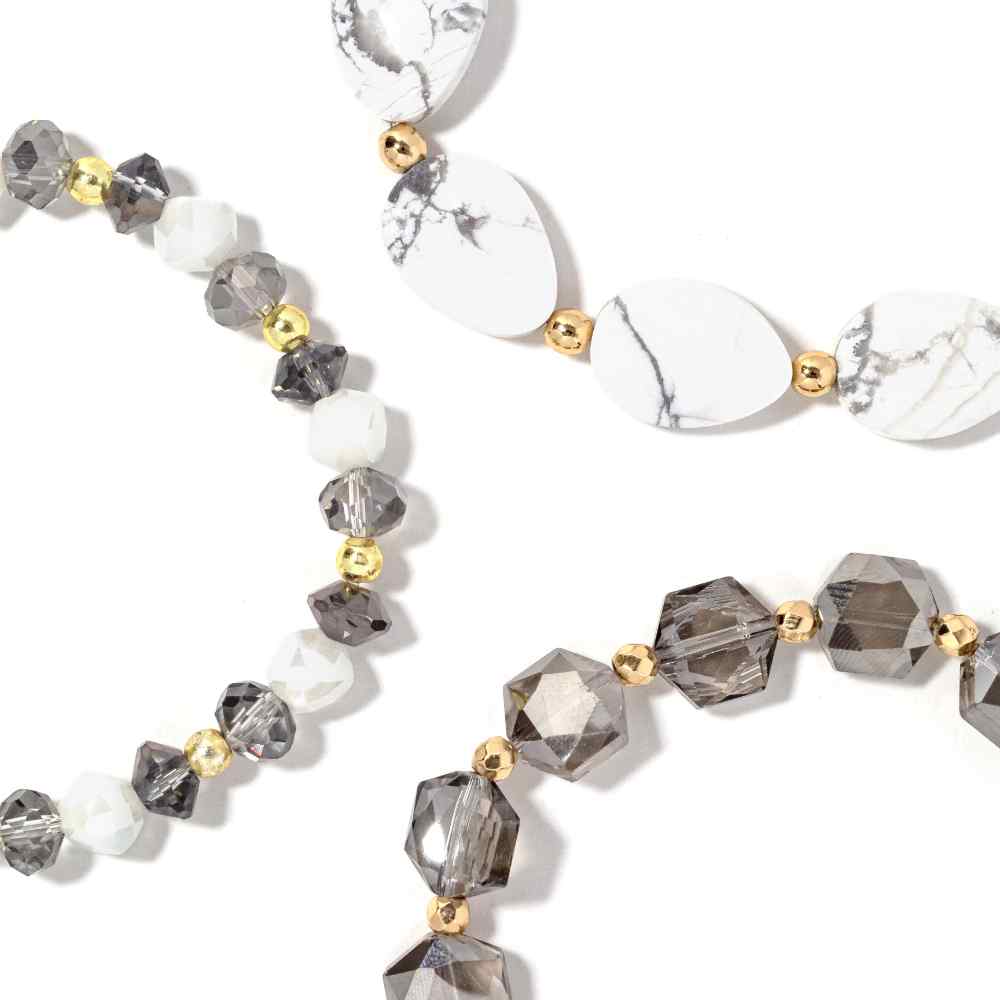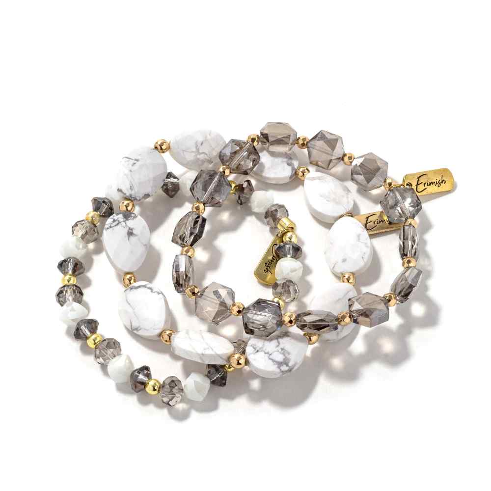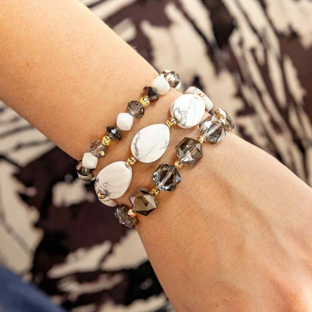 • Smoke: Layered elegance meets understated luxury in this refined bracelet stack. Combining soft gray and crisp white tones, each piece is designed to work beautifully on its own or harmonize with the others for a curated, modern aesthetic