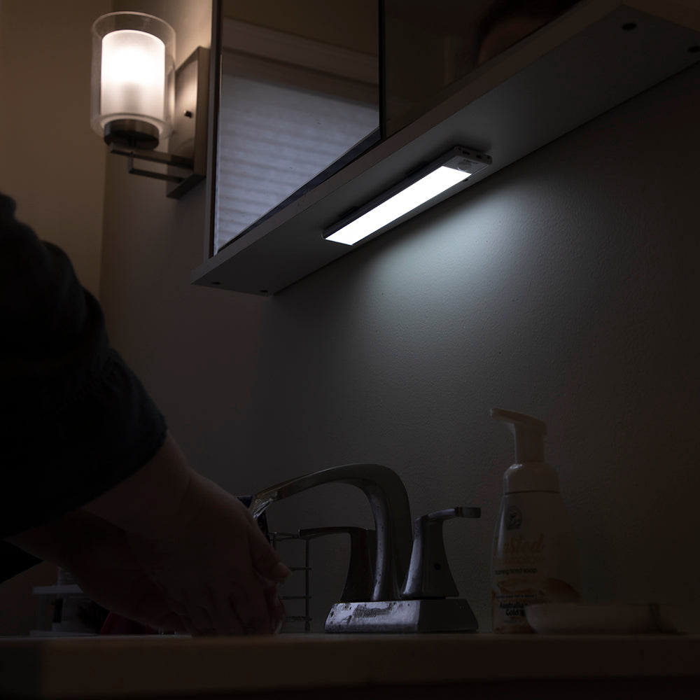 The Slim Rechargeable Motion-Activated Light Bar easily installs under cabinets, in bathrooms, in storage rooms, and anywhere else temporary, bright light is needed. Its magnetic back adheres to most smooth, rust-free metal surfaces. You can also mount this light to non-metallic surfaces by using the included peel-and-stick clips.