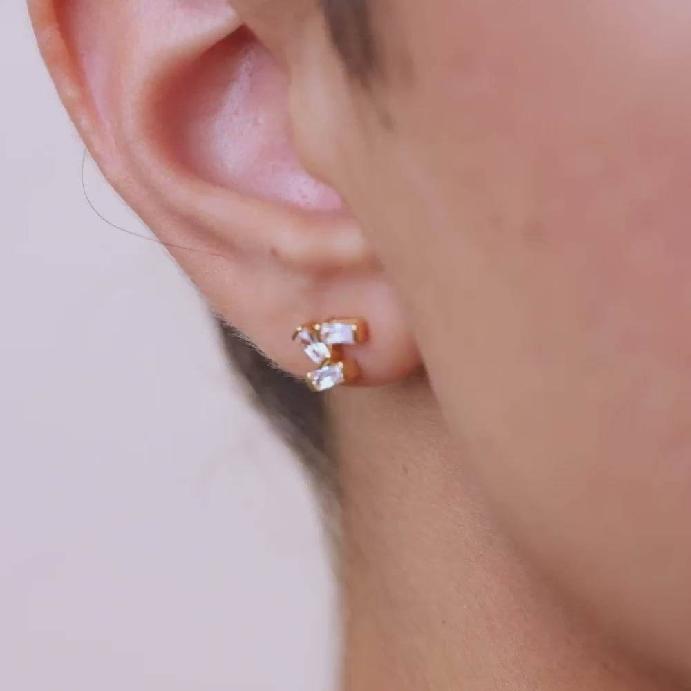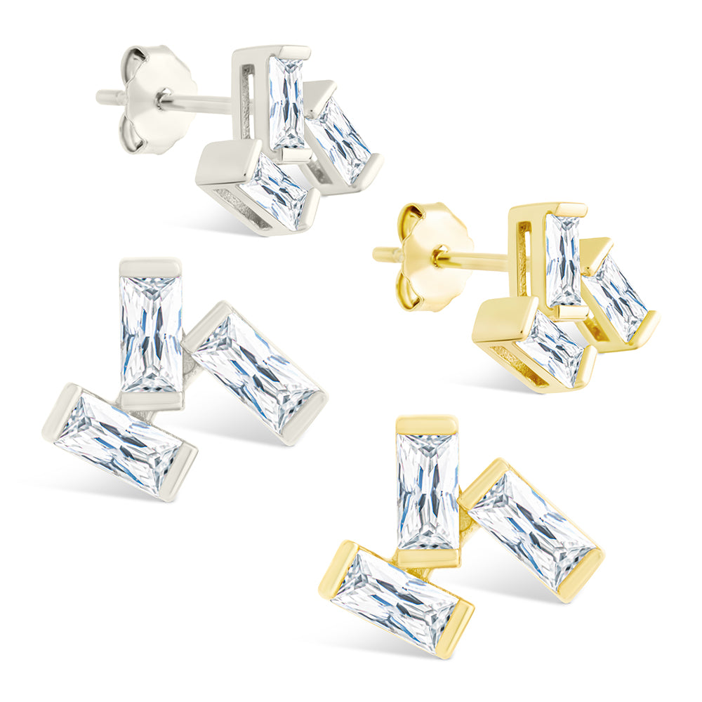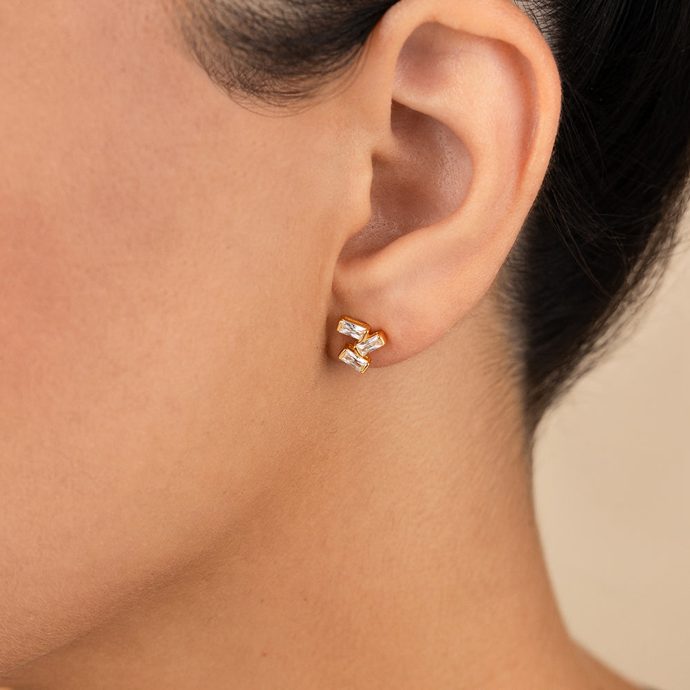 These earrings play with angles. The Macy Studs layer baguette cut, Hearts & Arrows stones into a sculptural trio. Sterling silver keeps the setting clean, while the angled cuts give a little extra lift.