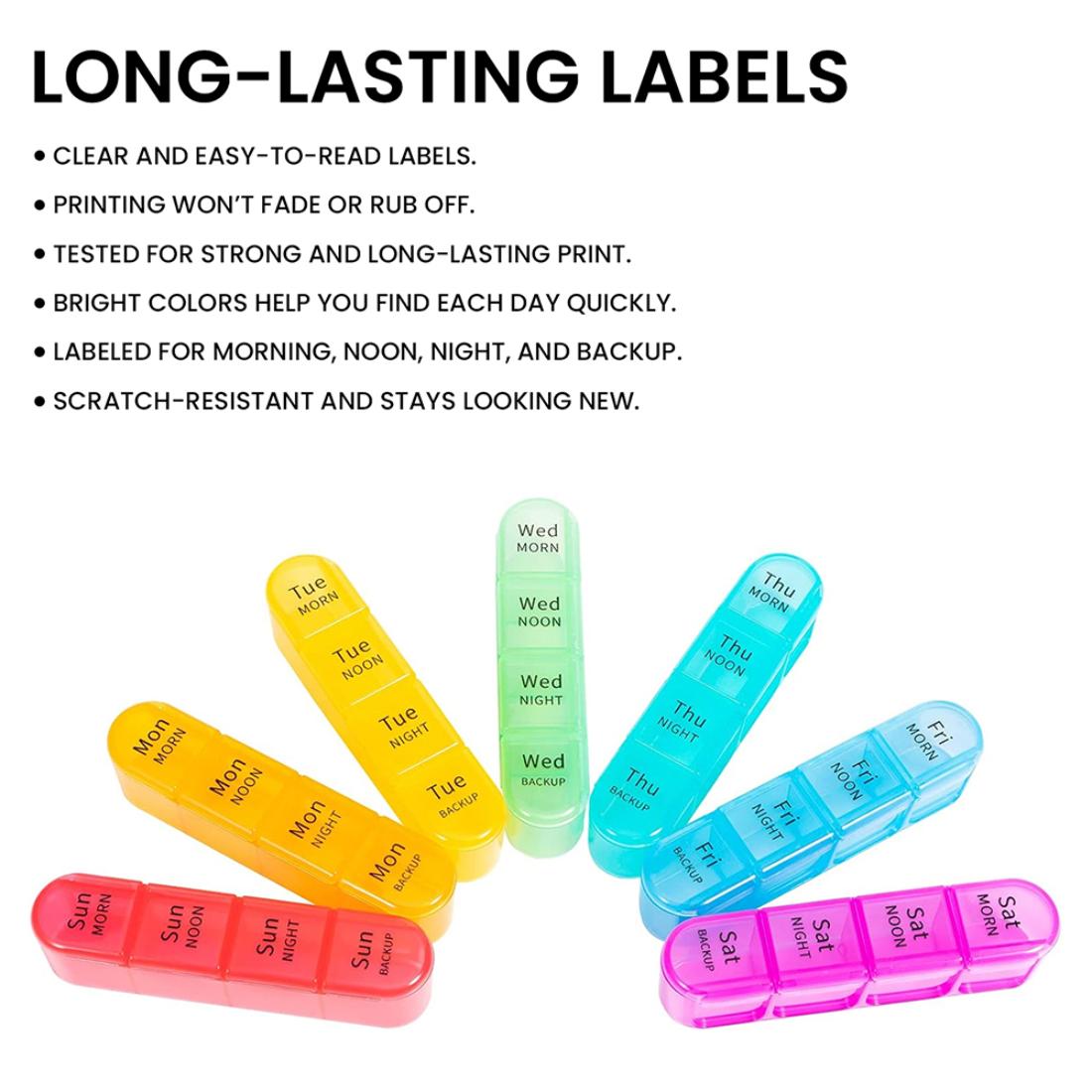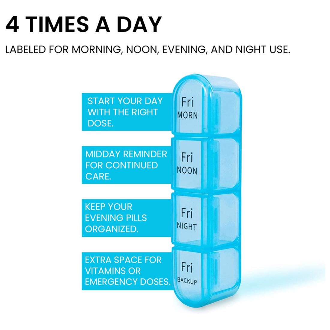 Managing daily medications is easier and more dependable with this large weekly pill organizer. Designed for individuals who take medications multiple times a day, it features four clearly divided compartments per day, making it simple to keep track of doses throughout the week.
