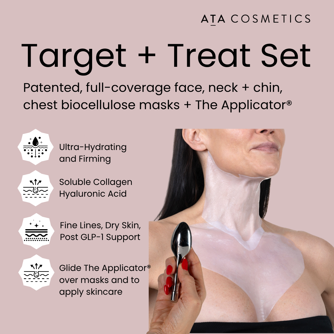 Experience next-level skin recovery. The Target + Treat Set pairs The Applicator®, ATA’s patented stainless-steel skincare/makeup applicator tool, with medical-grade biocellulose masks designed for full-coverage rejuvenation. This synergistic system is designed to enhance collagen, hydration, and absorption for lasting firmness and radiance.
