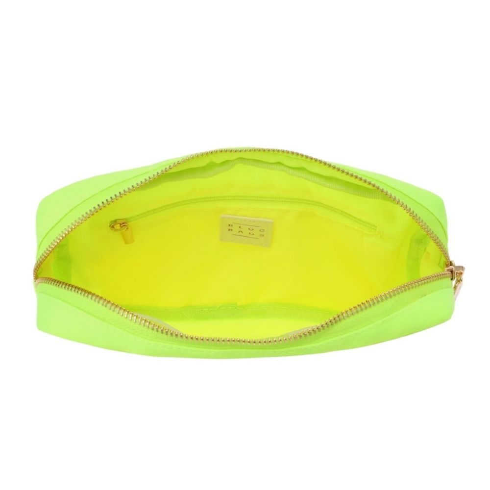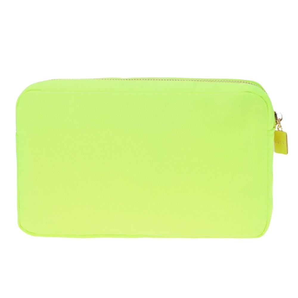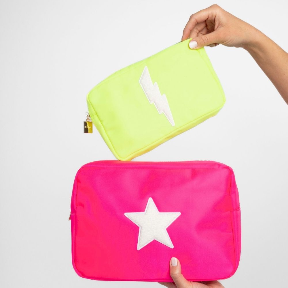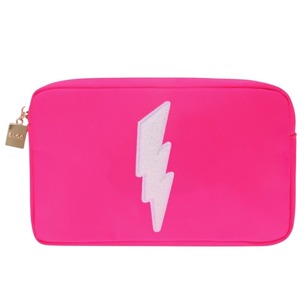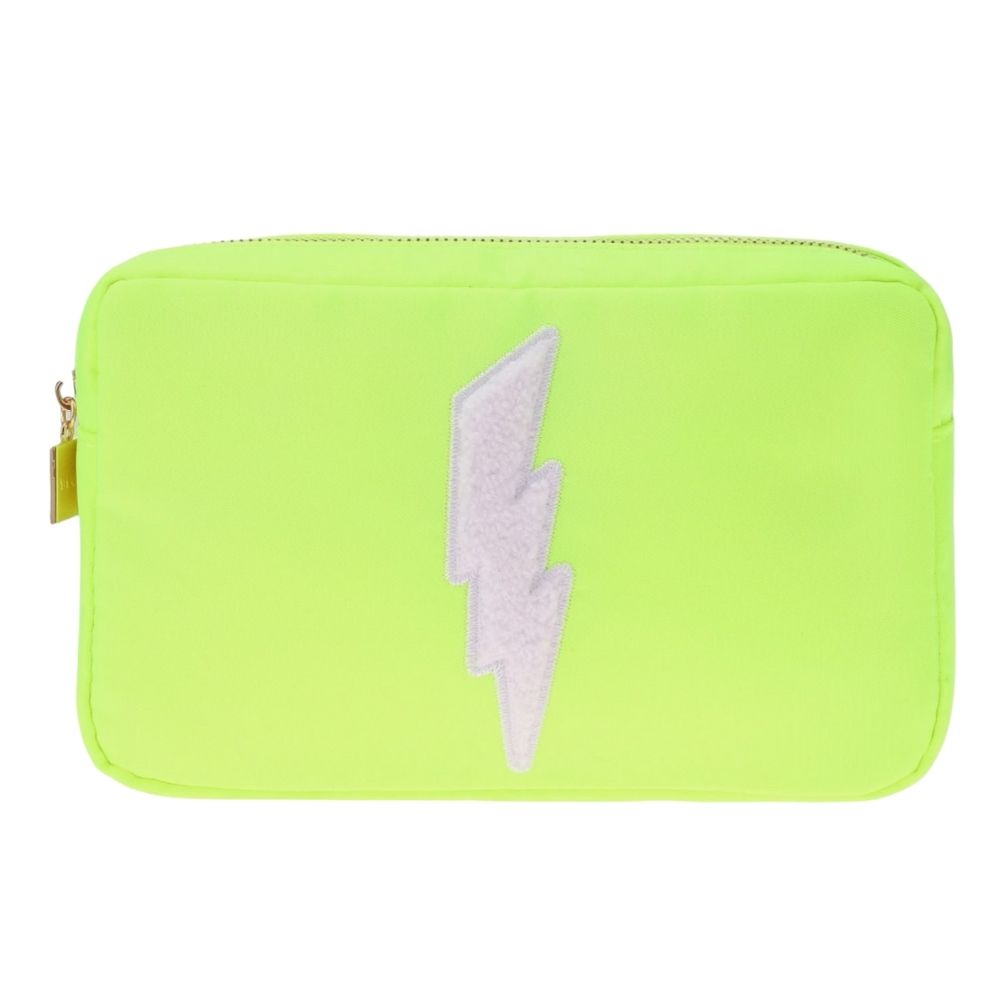 A playful neon cosmetics bag featuring an embroidered chenille lightning bolt patch on the front. This bright, playful bag is designed to keep makeup and skincare essentials secure wherever you go. A convenient zip closure and interior pockets make organizing products easy.