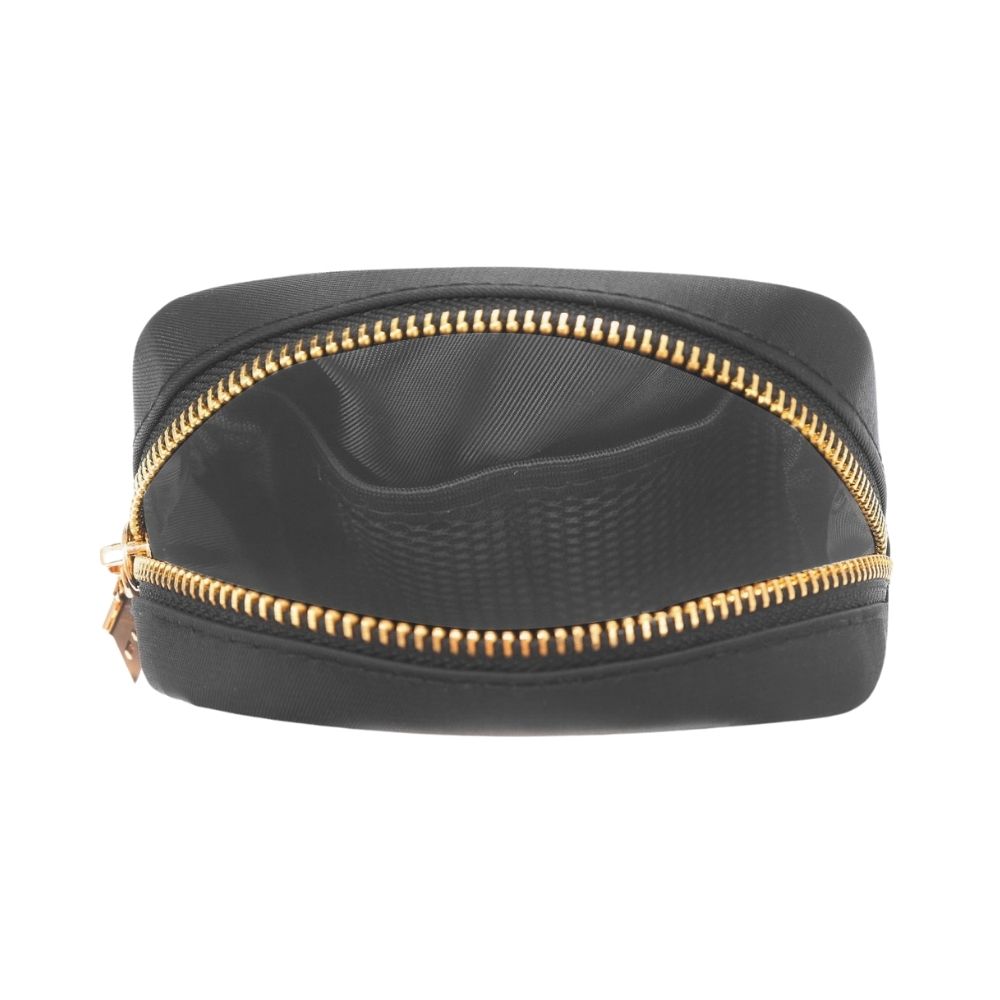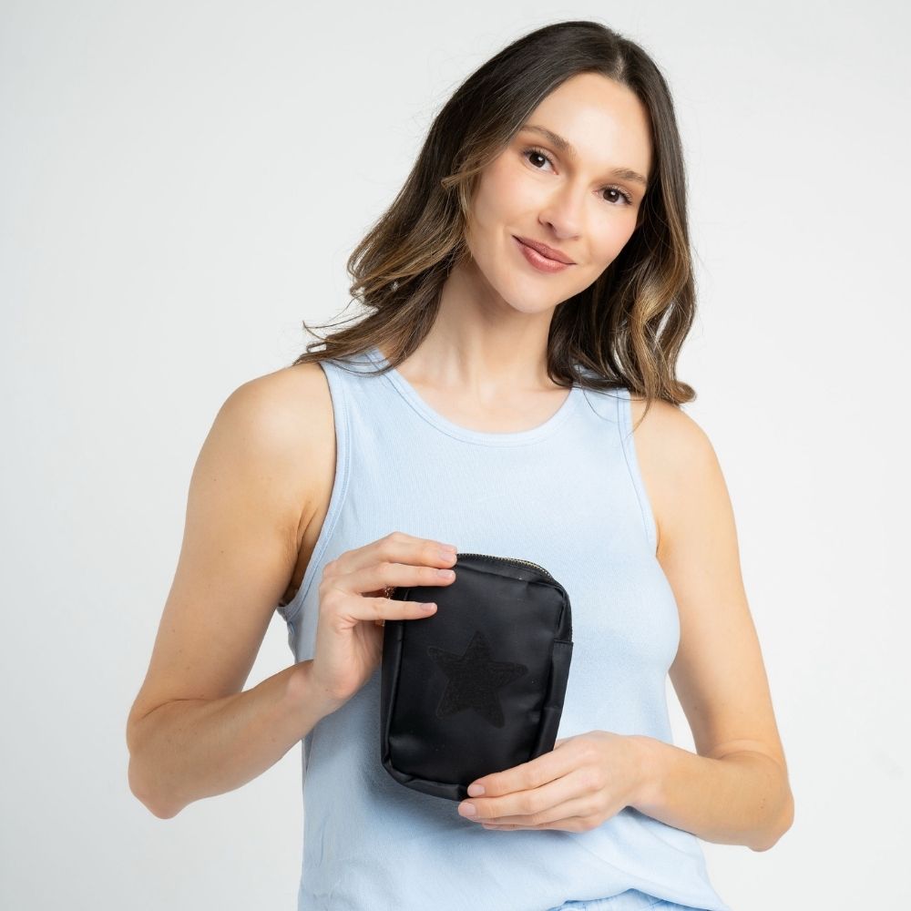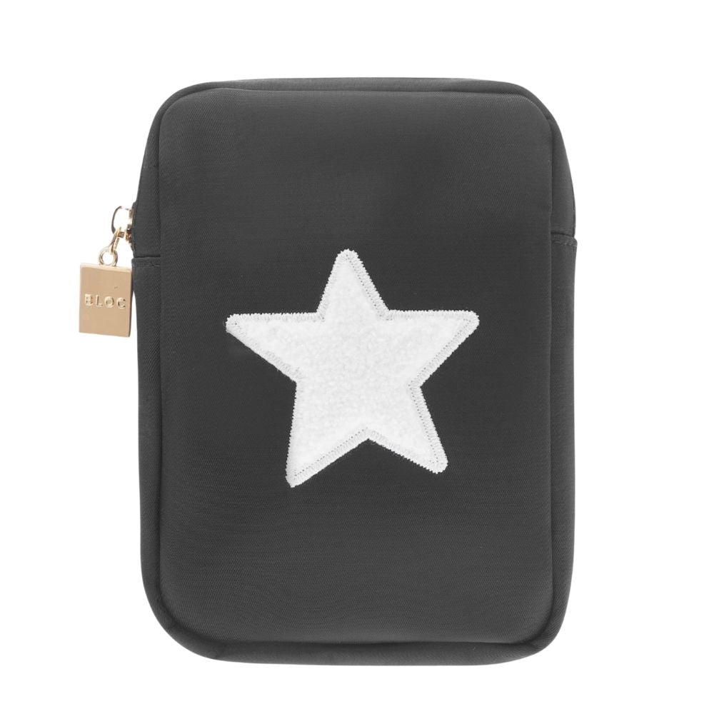 A mini nylon cosmetics bag featuring a darling chenille star patch on the front. This bag is ideal for storing lipstick and other smaller cosmetics when at home and on the go. It’s designed with a convenient top zip closure and interior pockets for easy organizing.
